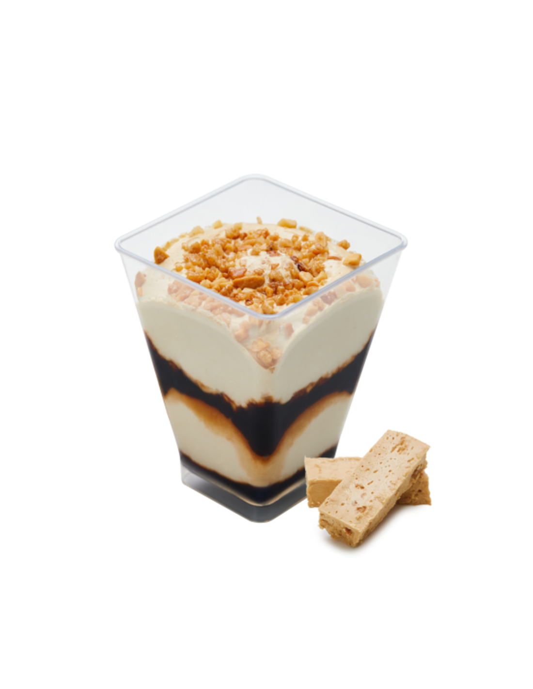 Ingredientes: Leche desnatada en polvo reconstituida, salsa de caramelo (azúcar, agua, jarabe de glucosa, almidón modificado, colorante: E 150c), azúcar, agua, grasa de coco, turrón (4,5 %) [almendra, jarabe de azúcares (azúcar, jarabe de glucosa y fructosa, agua), miel, clara de huevo], jarabe de glucosa, suero lácteo en polvo, almendra (2,7 %), emulgentes (monoglicéridos y diglicéridos de ácidos grasos, E 477), estabilizantes (goma garrofín, goma guar, carragenanos), colorante (caramelo natural). Puede contener gluten y otros frutos de cáscara.