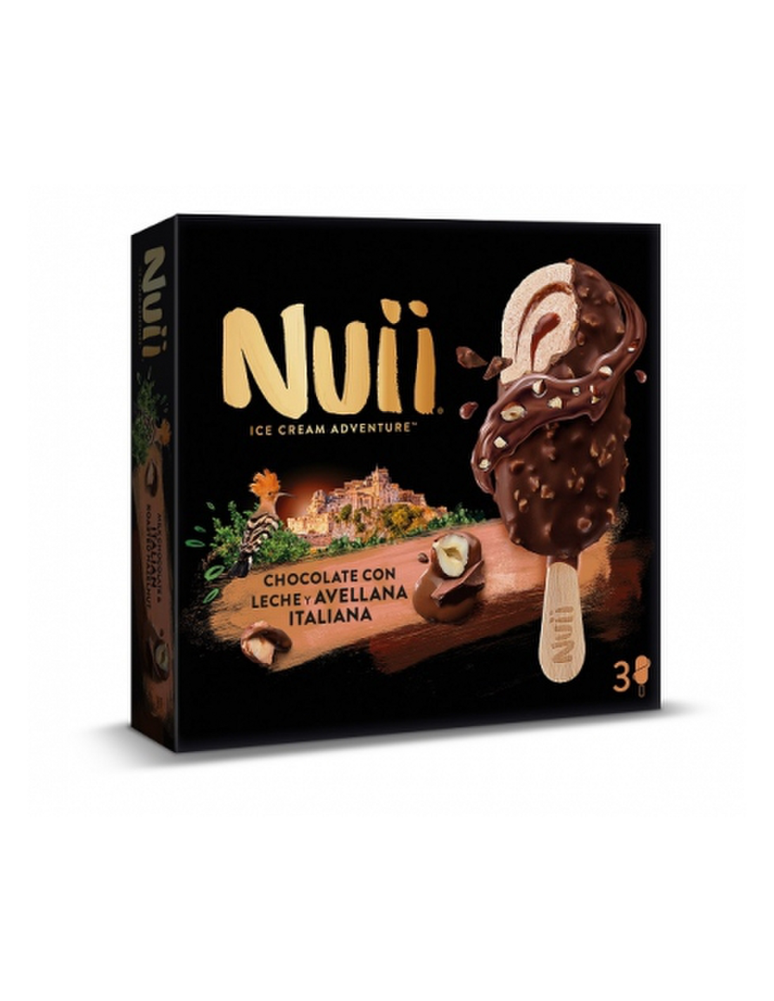 Ingredientes: LECHE desnatada en polvo reconstituida, azúcar, NATA (12 %), jarabe de glucosa, manteca de cacao, pasta de cacao, LECHE desnatada en polvo, trozos de AVELLANAS italianas tostadas, pasta de AVELLANAS italianas tostadas (3 %), butteroil (LECHE), agua, suero LÁCTEO en polvo, jarabe de azúcar invertido, emulgentes (monoglicéridos y diglicéridos de ácidos grasos, lecitinas (SOJA), E 476), estabilizantes (goma garrofín, goma guar), harina de TRIGO, cacao magro en polvo, almidón modificado, aroma natural, grasa de coco, sal, jarabe de azúcar caramelizado. Puede contener: CACAHUETES, otros FRUTOS DE CÁSCARA, HUEVO y otros cereales que contienen GLUTEN.