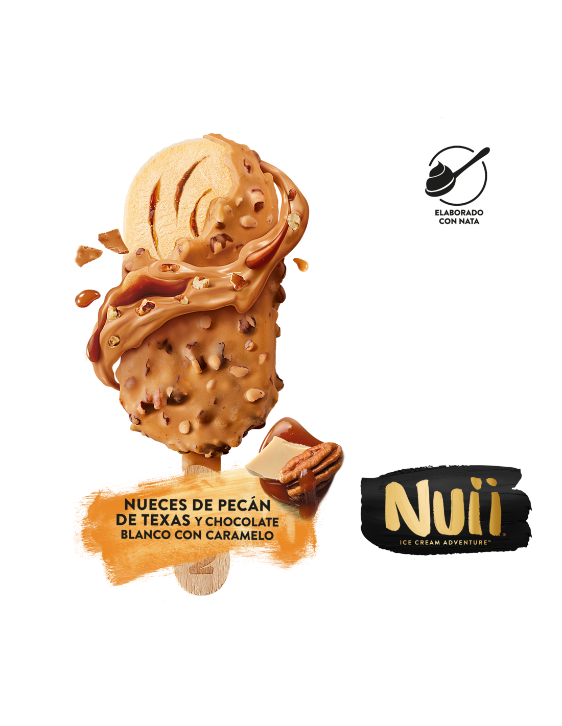 Ingredientes: leche desnatada en polvo reconstituida, azúcar, nata (13,5 %) (leche), jarabe de glucosa, manteca de cacao 1, leche en polvo, trozos de nueces pacanas de Texas tostadas (4,5 %), leche desnatada en polvo, agua, azúcar caramelizado (0,9 %), caramelo en polvo (0,45 %) (azúcar, leche desnatada en polvo), emulgentes (monoglicéridos y diglicéridos de ácidos grasos, lecitinas (soja), E 476), estabilizantes (goma garrofín, goma guar), materia grasa láctea anhidra (leche), leche condensada (leche, azúcar), sal (0,16 %), almidón modificado, concentrado de zanahoria, extracto de vainilla, extracto de malta (cebada, trigo), gelificantes (pectinas, goma xantana), aromas naturales. 1Certificado Rainforest Alliance. Más información en ra.org. Puede contener: CACAHUETE, ALMENDRAS, AVELLANAS, NUECES, ANACARDOS, NUECES DE BRASIL, PISTACHO, NUECES MACADAMIA, HUEVOS y AVENA.