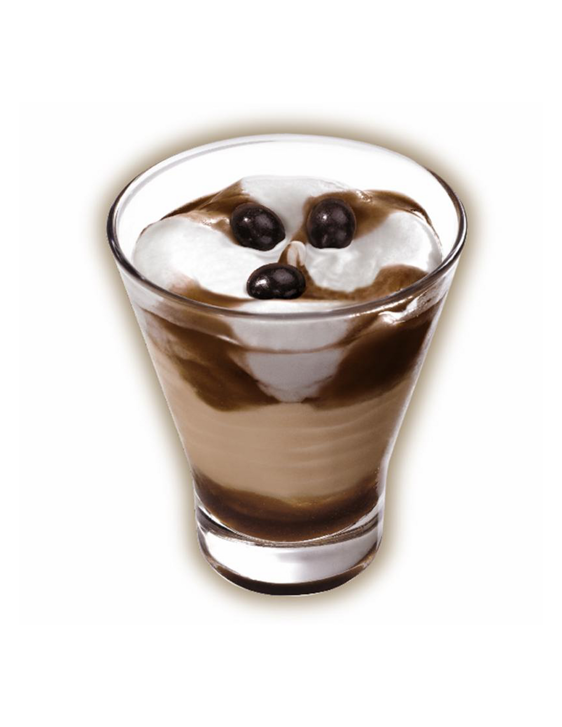 Ingredientes: leche fresca desnatada pasteurizada (27%), nata (16%), azúcar, jarabe de glucosa, agua, mantequilla, jarabe de glucosa y fructosa, infusión de café (5,3%) (agua, café molido tostado 2 %), granos de chocolate sabor café (4,7%) [azúcar, pasta de cacao, manteca de cacao, extracto de café, agua, agentes de recubrimiento (goma arábiga, goma laca), aroma natural de vainilla, alcohol, jarabe de glucosa, grasa vegetal (coco), corrector de acidez (ácido cítrico)], leche desnatada en polvo, yema de huevo, café soluble (0,6%), almidón modificado de maíz, emulgente (monoglicéridos y diglicéridos de ácidos grasos), estabilizantes (carragenanos, goma garrofín, goma guar), aromas naturales. Puede contener frutos de cáscara.