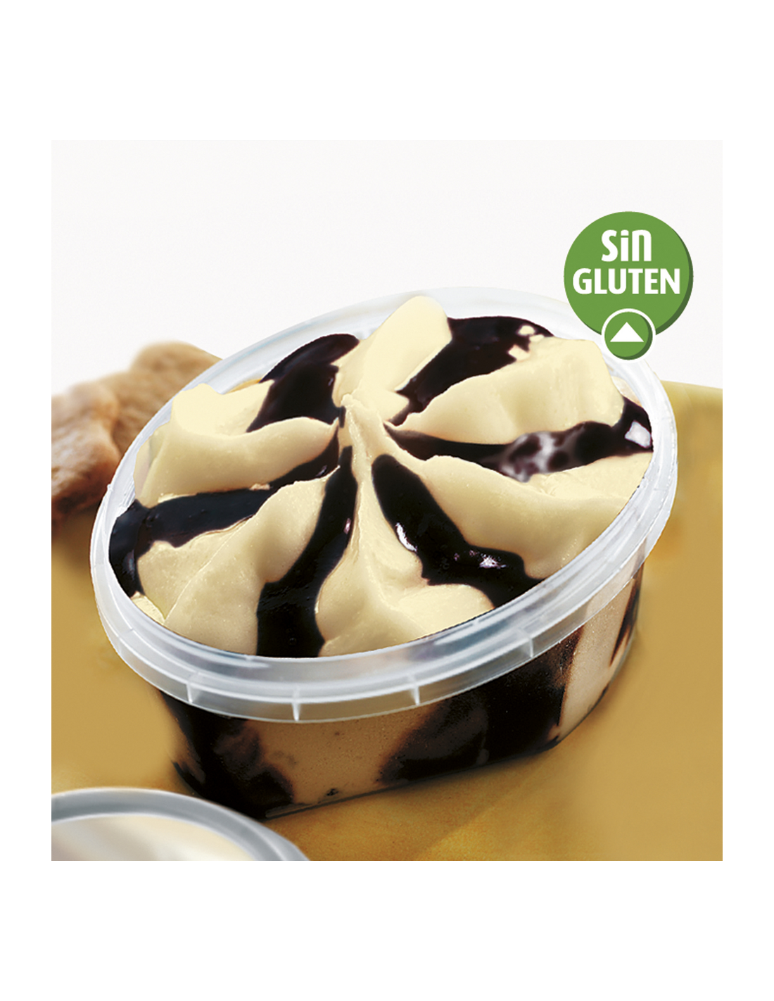 Ingredientes: Leche desnatada en polvo reconstituida, agua, azúcar, jarabe de glucosa, grasa de coco, suero lácteo, cacao magro, emulgente (monoglicéridos y diglicéridos de ácidos grasos), pasta de cacao, estabilizantes (goma garrofín, goma guar, carragenanos), almidón modificado de tapioca, aromas, sal, colorante (carotenos). Puede contener frutos de cáscara. Chocolate en la salsa: 3%. SIN GLUTEN.