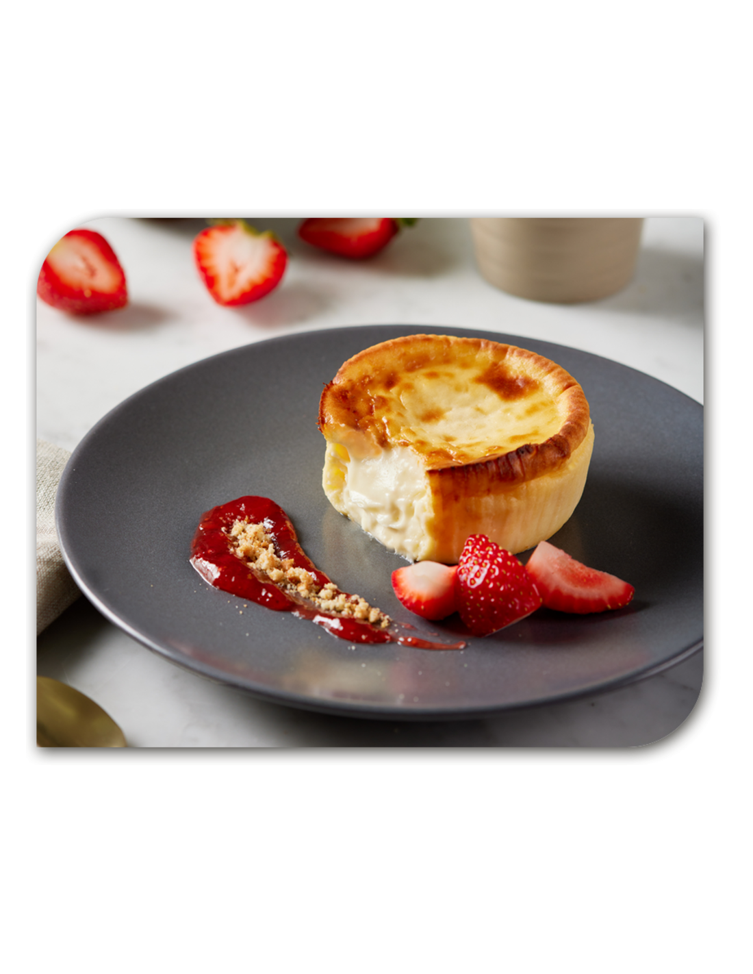 Ingredientes: Queso blanco pasteurizado 33% (leche pasteurizada de vaca, nata, fermentos, sal, estabilizantes: E-466, E-406, E-417), nata (nata, estabilizante: E-407), huevo pasteurizado, azúcar, queso blanco pasteurizado 7% (leche pasteurizada de vaca, nata, proteínas de leche, sal, estabilizante: E 410, conservador: E 200, fermentos lácticos), leche, harina de trigo, mantequilla, almidón de maíz, sal, estabilizante: goma xantana.