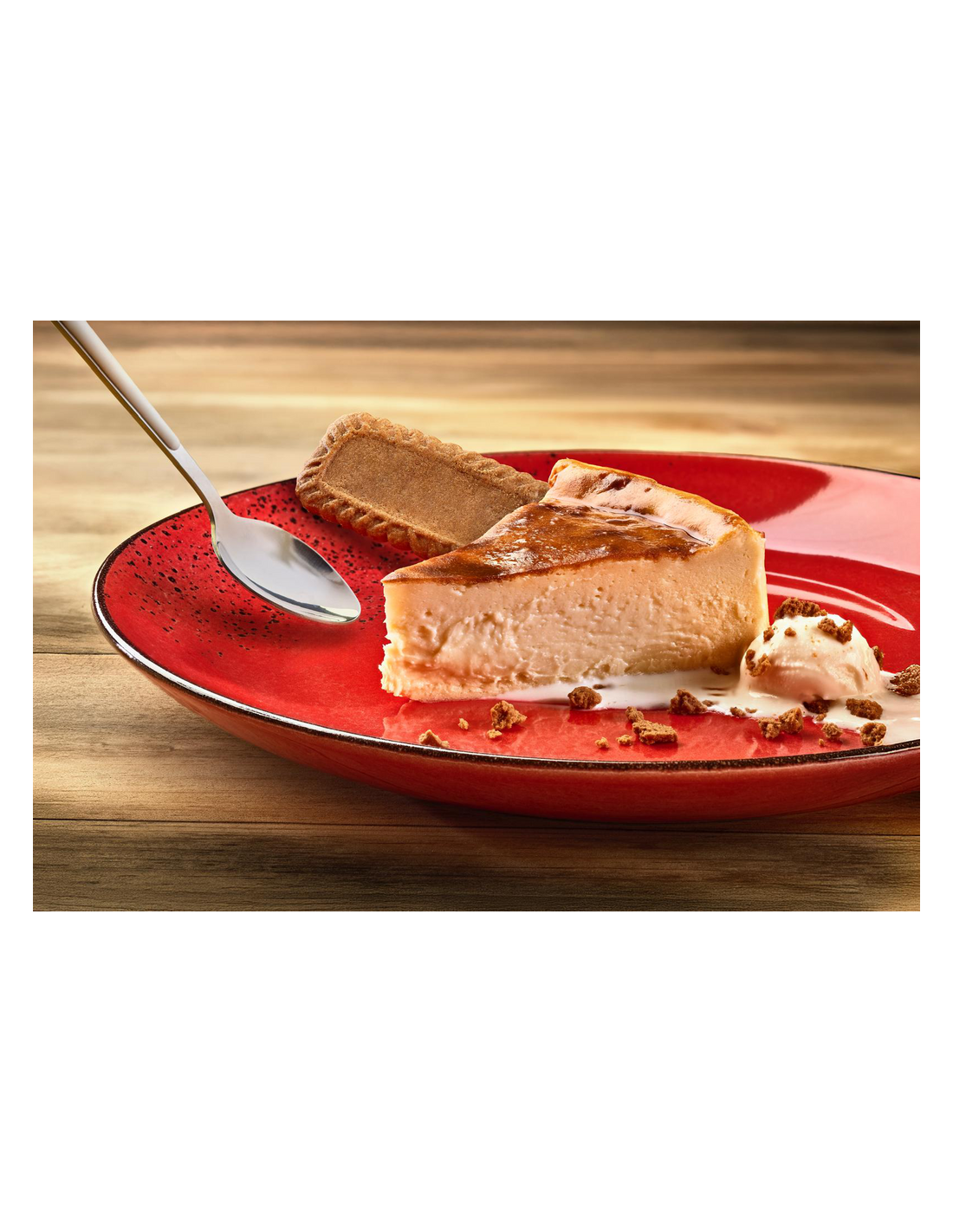 Ingredientes:Queso blanco pasterizado 40% (leche pasterizada de vaca, nata, fermentos, sal, estabilizantes: carboximeil celucosa sódica, agar-agar, goma tara), nata (nata, estabilizante: carragenano), huevo pasterizado, azúcar, pasta de especuloos 7,4% (harina de trigo, azúcar, aceites vegetales: palma*, colza, jarabe de caramelo, gasificante: carbonato ácido de sodio, harina de soja, sal, canela, aceite de colza, azúcar, emulgente: lecitinas de soja, acidulante: ácido cítrico), harina de trigo, estabilizante: goma xantana.