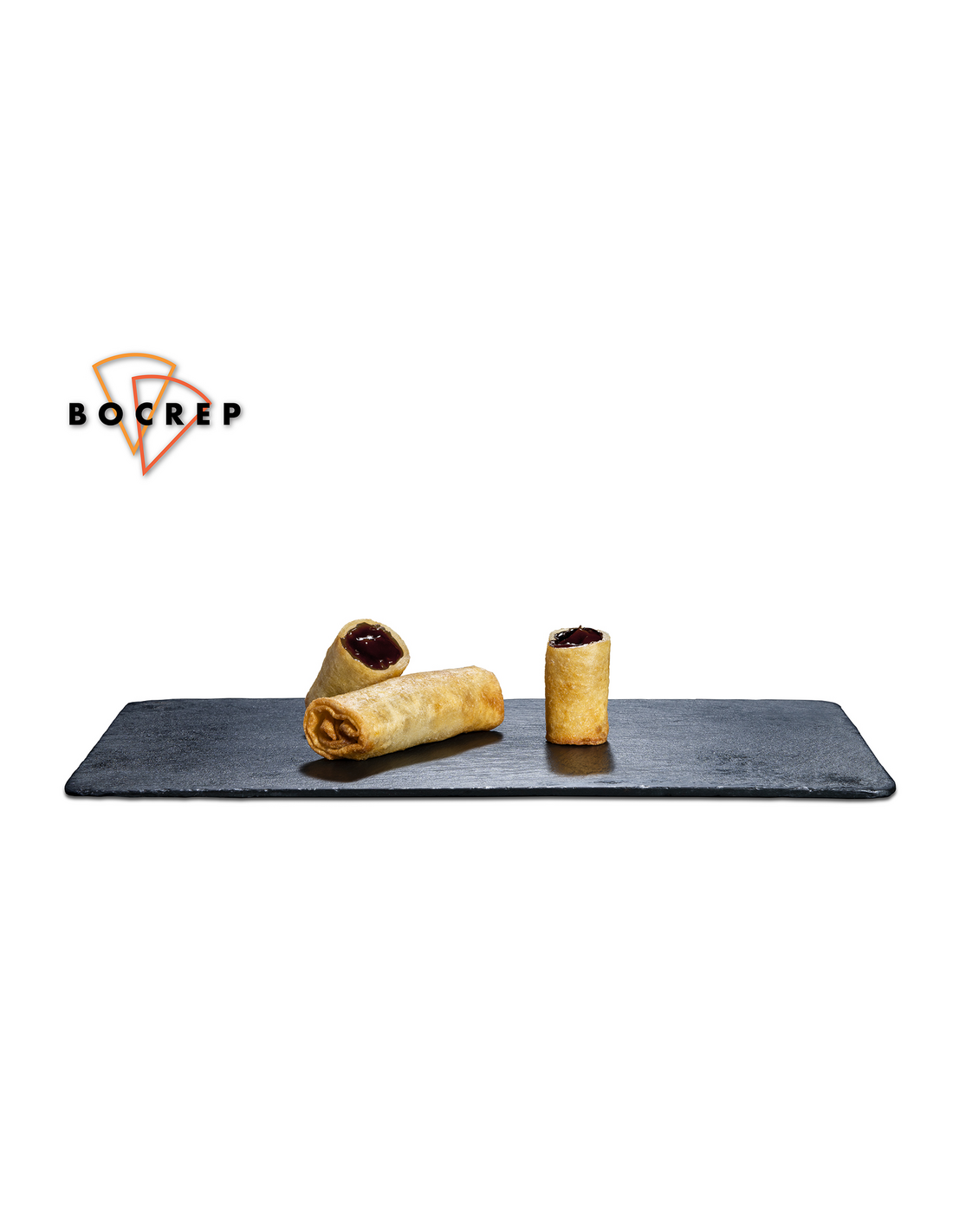 Ingredientes: crepe (50%): Harina de trigo (GLUTEN), agua, suero de LECHE en polvo, HUEVO líquido pasteurizado, clara de HUEVO líquida pasteurizada, sal y aceite de girasol. Relleno (50%): Agua, crema de chocolate (52%* , azúcar, cacao desgrasado en polvo, aceite de girasol, pasta de AVELLANA, emulgente: lecitina de SOJA, aroma de vainilla), azúcar, proteína de la LECHE, almidón modificado de patata, sal, gelificantes (alginato sódico y sulfato de calcio), estabilizantes (fosfato y difosfato sódico), espesantes (gomas xantana y guar), aroma de vainilla. Contenido en cacao: 12%*. * Porcentaje calculado sobre el relleno.