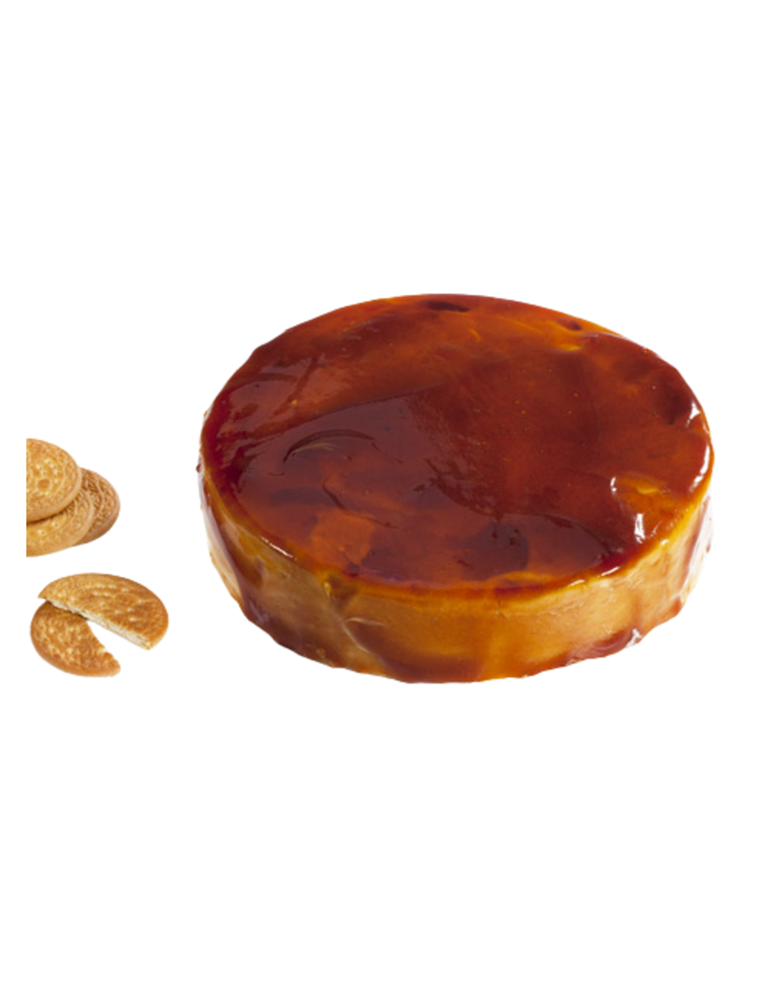 Ingredientes: Crema vegetal [suero de MANTEQUILLA dulce, aceite vegetal (25%)(almendra de palma, coco, palma, colza), aceite de almendra de palma totalmente hidrogenado (8%), almidón modificado, emulgentes (E472b, E435, E433), aroma, estabilizante (E407), colorante (E160a)]; preparado UHT [NATA ligera 15% M.G. (40%), LECHE desnatada, aceite vegetal (22%)(almendra de palma, coco, palma, nabina), aceite de almendra de palma totalmente hidrogenado (7%), emulgentes (E472b,E435, E433, E471), estabilizador (E401)]; preparado de caramelo(15%) [azúcar, grasa vegetal totalmente hidrogenada (almendra de palma), cacao magro en polvo (6%), almidón de maíz, suero de LECHE en polvo, aceites vegetales (girasol, palma), fibra de cacao, emulgentes (E322, E492) y aroma]; azúcar; galleta (12%) [harina de TRIGO 70%, azúcar, aceite vegetal (girasol alto oleico) 9%, jarabe de glucosa-fructosa, suero de LECHE en polvo, gasificantes (E500, E503), sal, emulgente (E322 (SOJA)), antioxidante (E223 (SULFITOS)), aroma]; agua; harina compuesta [azúcar, harina de TRIGO, cacao (7%), almidón de TRIGO, almidón de patata, suero de LECHE en polvo, gasificantes (E500, E450), emulgentes (E475, E471), GLUTEN de TRIGO, clara de HUEVO en polvo, sal, espesantes (E466,E415)]; HUEVO liquido pasteurizado; aceite de girasol; gelatina en polvo; LECHE en polvo; conservante (E202); canela en rama.