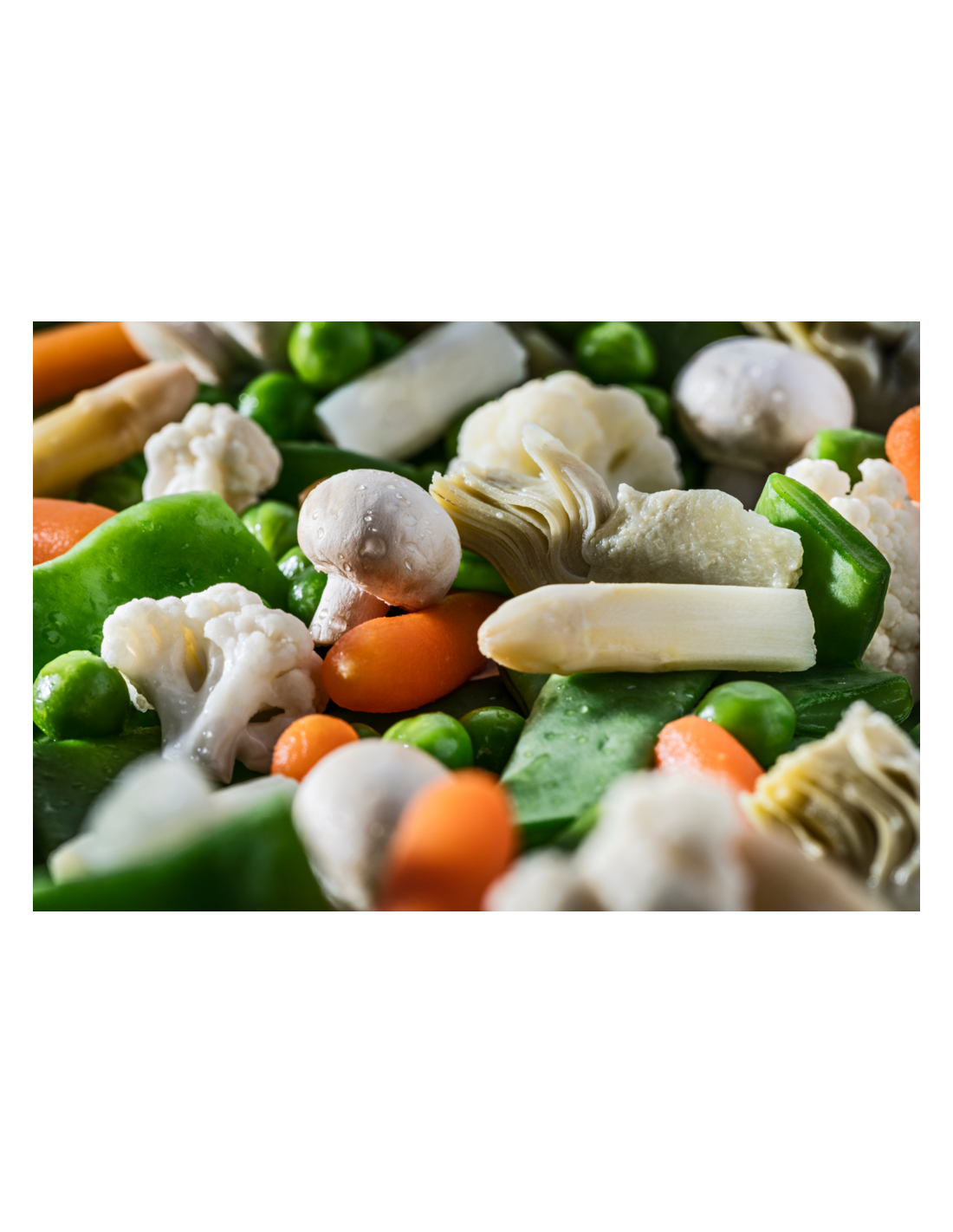 Ingredientes: Judías verdes planas, zanahorias jóvenes, corazones de alcachofa (acidulante: ácido cítrico), guisantes dulces, coliflor, espárragos blancos, setas.