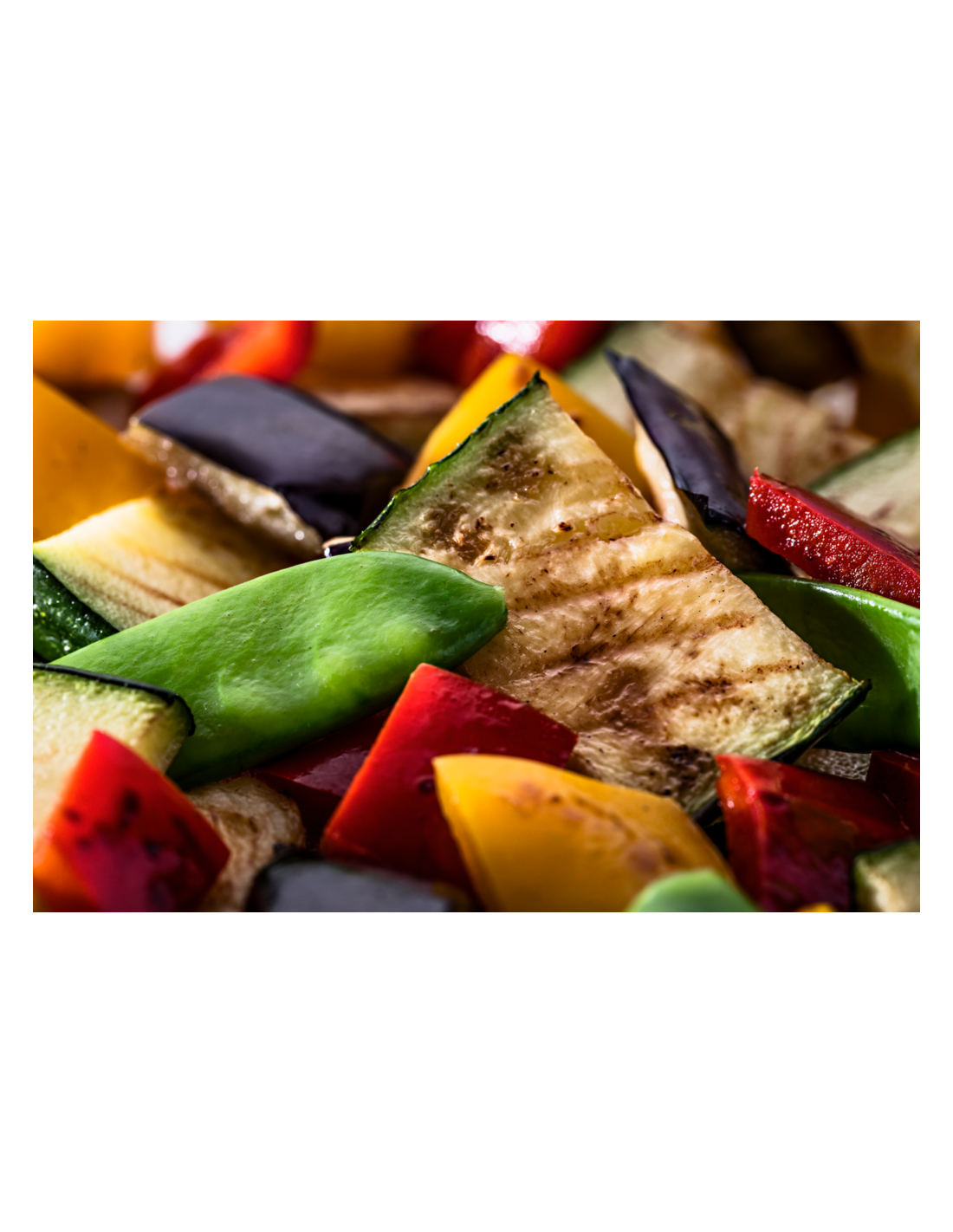 Ingredientes: Calabacines verdes a Ia plancha 41%, tirabeques, berenjenas prefritas (berenjenas, aceite de girasol), pimientos rojos a la plancha 12%, pimientos amarillos a la plancha 12%.