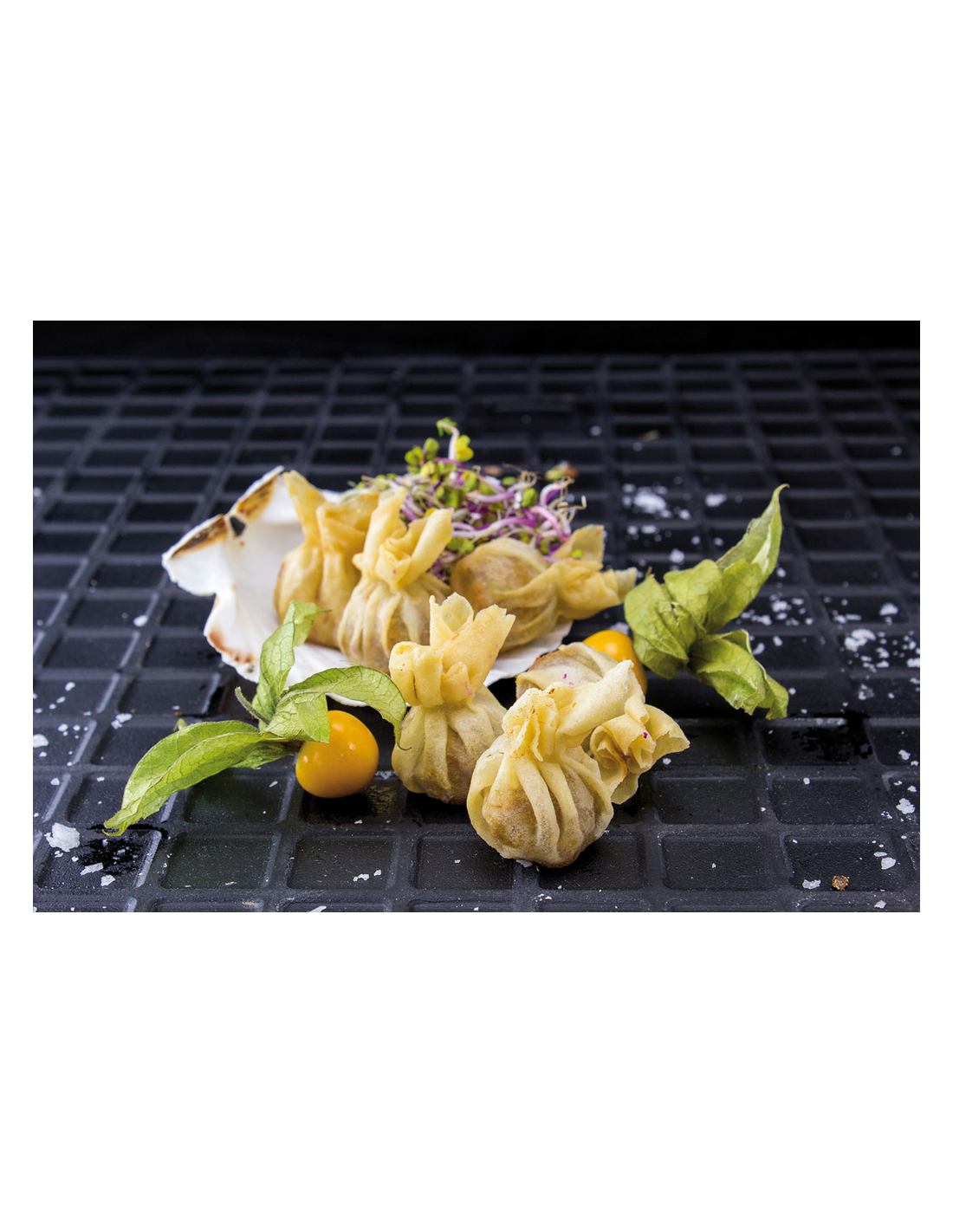 Ingredientes: Relleno (80+/-5%)(molla ALMEJA (38+/-5%)(MOLUSCO, sal, agua), cebolla, vino blanco (mosto de uva blanca, conservador METABISULFITO potásico), aceite de oliva virgen extra, ajo, almidón modificado, harina de TRIGO, sal, azúcar y perejil), pasta (20+/- 5%)(harina de TRIGO, agua).