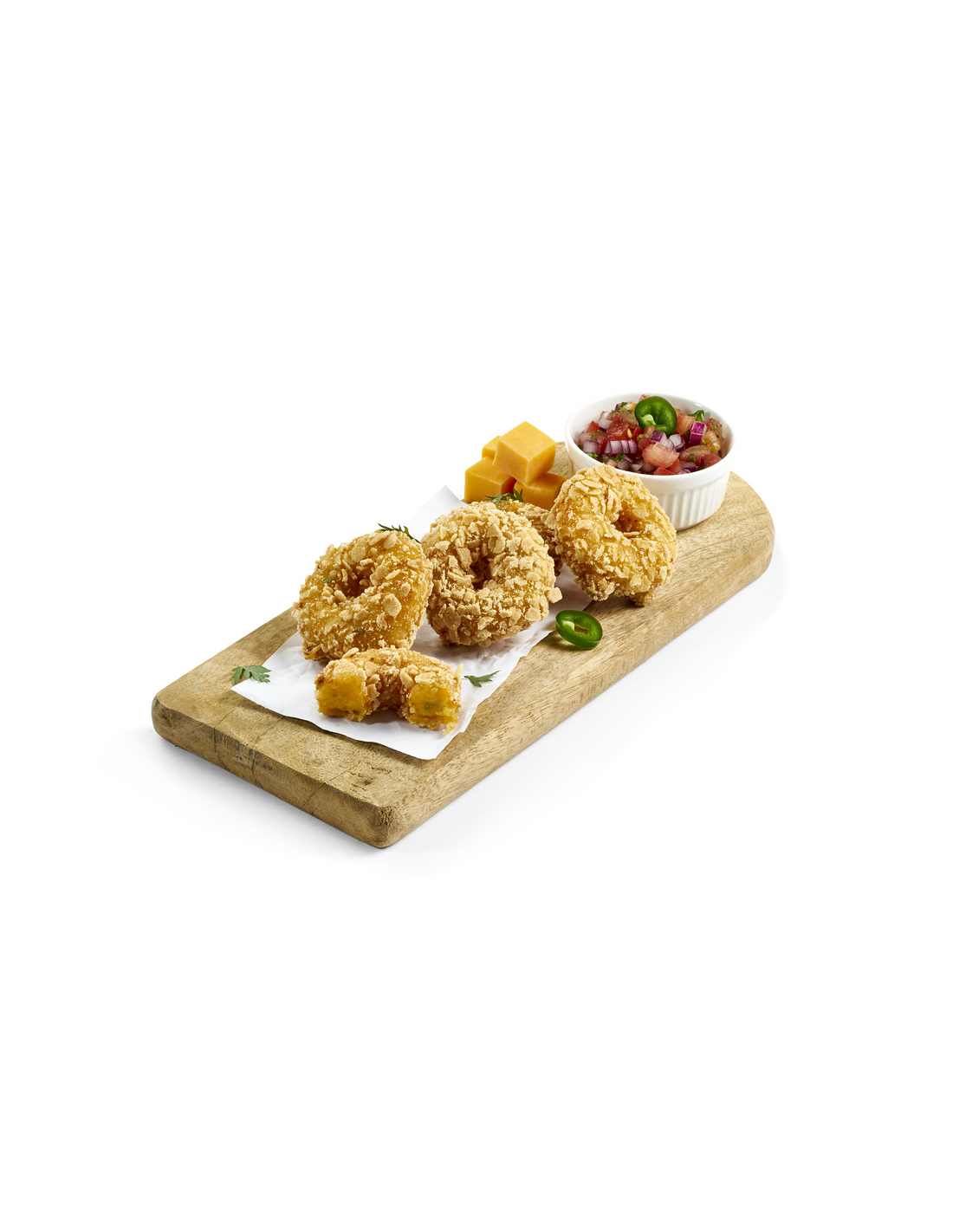 Ingredientes: Queso cheddar (28%) [leche pasteurizada de vaca, fermentos lácteos , cuajo, sal, colorante (E160a (iii)], agua, queso fundido [agua, lactosuero , almidón, queso , almidones modificados (E 1420, E 1422), mantequilla, sales de fundido (E 331, E 452, E 339), sal, aromas, corrector de acidez (E 330), colorante (E 160c)], pan rallado [harina de maíz, harina de arroz, azúcar, fibra vegetal, sal, colorante (E 150a), extractos de especias], aceite vegetal (girasol o nabina), pimiento verde, almidón de maíz, preparado para rebozar [harina de trigo, almidón oxidado (E 1404), maltodextrina, gluten de trigo , clara de huevo en polvo, fibra de guisante, aceite de girasol, sal], jalapeño (2%), espesante (E 461 ), almidón, fibra de bambú.