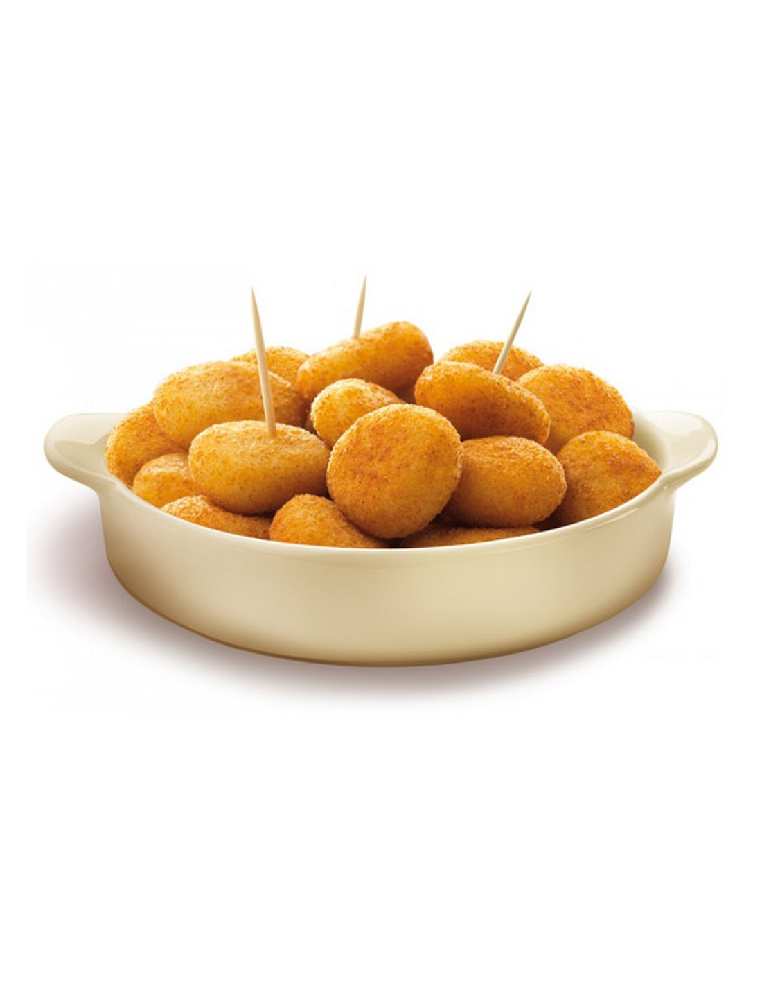 Ingredientes: Relleno (88%): agua, harina de trigo , manteca de cerdo, suero de leche en polvo, almidón, aroma, potenciadores del sabor (E621, E627, E631), aceite vegetal*, queso fundido [queso , sólidos lácteos , mantequilla , almidones modificados (E1420, E1422), corrector de acidez (E330), sales de fundido (E331, E452 y E339), sal, aroma], sal, espesante (E461), pan rallado (harina de trigo, salvado, agua, sal, levadura). *Ver tipo de aceite impreso debajo del número de lote. Empanado: agua, harina de trigo, proteína de soja , albúmina de huevo en polvo, espesante (E464), conservador (sorbato potásico). Consultar trazas de alérgenos.
