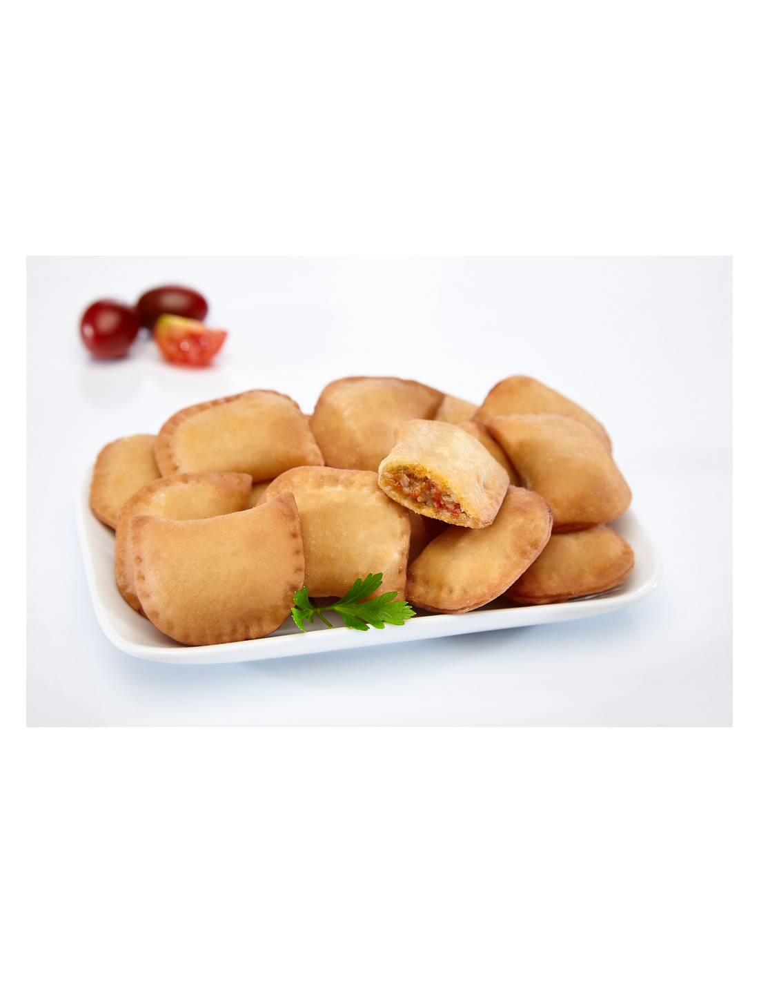 Ingredientes: Relleno (45%): Pimiento, carne de vacuno y cerdo (9%) [carne, sal y estabilizante E-451], aceite de girasol, tomate, azúcar, sal, aromas, especias (cebolla,cayena, pimienta, ajo, jengibre), corrector de acidez (E-331i), almidón, IX)potenciador de sabor (E-621), proteína de SOJA hidrolizada, extracto de levadura, zanahoria, APIO, agua, rallado [Harina de TRIGO (GLUTEN), agua, sal, levadura], espesantes (E-461, E-407, E-1420), vinagre de vino, azúcar, comino. OBLEA (55%): Harina de TRIGO (GLUTEN), agua, manteca de cerdo, aceite de girasol, dextrosa y sal.