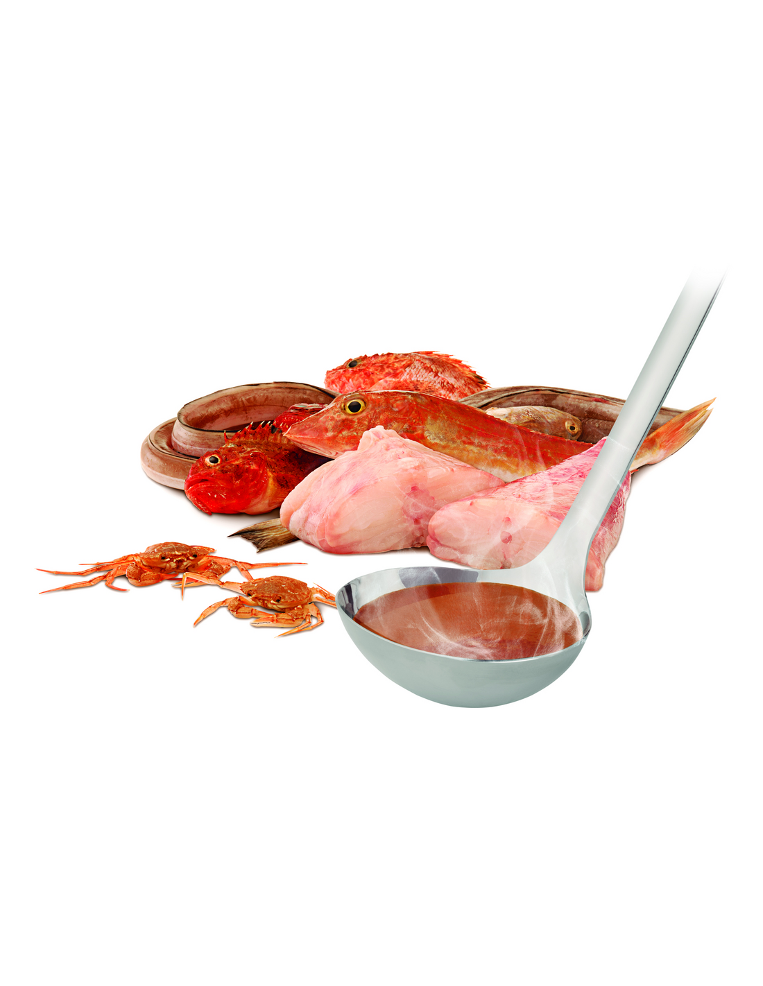 Ingredientes: Agua, pescado de roca (18%), rape blanco (9%), cangrejos (5%), tomate, aceite de oliva (3%), zanahoria, vino blanco, cebolla frita (cebolla, aceite de girasol), sal, puerro, galera , harina de arroz, dextrosa, fibra vegetal, sal, colorante (caramelo natural), especias, hinojo, ajo. Consultar trazas de alérgenos.
