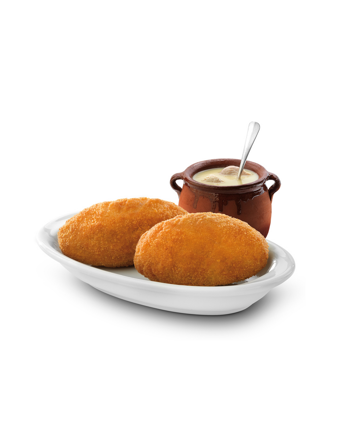 Ingredientes: Relleno (89%): Producto lácteo reconstituido (agua, lactosa, grasa de leche, proteínas de leche), agua, carnes (29%)[carne de ave pollo y/o pavo), carne de cerdo, carne de vacuno], almidón, margarina [grasa de palma, aceite de girasol, agua, sal, emulgente (E 471), acidulante (ácido cítrico), aromas], harina de trigo, cebolla, suero de leche, grasa de palma y/o ccm, jamón serrano, almidón aceite de girasol, vino, sal, zanahoria, apio, puerro, aromas (contiene leche), caldo deshidratado de verduras, caldo deshidratado de pollo, potenciadores del sabor (E 621, E 627, E 631, E 363). *Carne separada mecánicamente de pollo. (Porcentajes calculados en base al relleno).