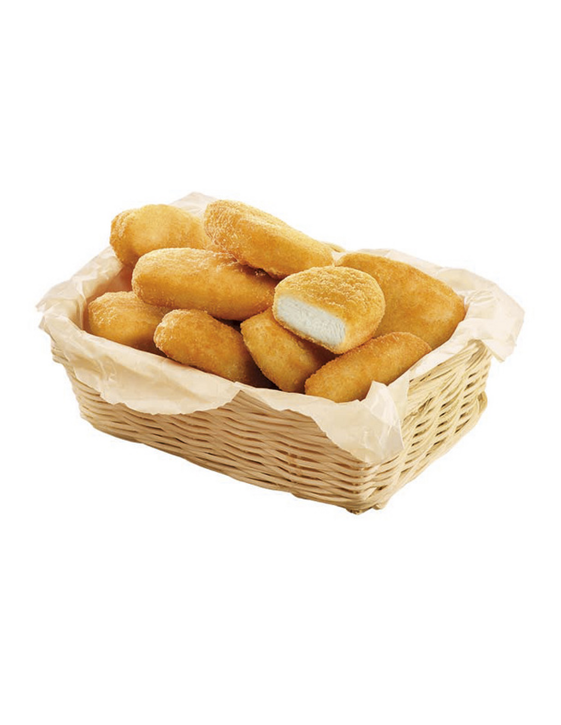 concentrado de pollo, fibras vegetales (trigo, bambú), aroma (contiene huevo), potenciadores del sabor (E 621, E 631, E 627), estabilizantes (E 451i, E 450iii), proteína de soja, caldo deshidratado de verduras, cebolla deshidratada, azúcar y extracto de levadura. (Porcentajes calculados en base al relleno). Empanado: pan rallado (harina de trigo, agua, sal, levadura), aceite de girasol, agua, harina y almidón de trigo, sal, gasificantes (E 450, bicarbonato sódico) y harina de maíz. Consultar trazas de alérgenos. ALÉRGENOS