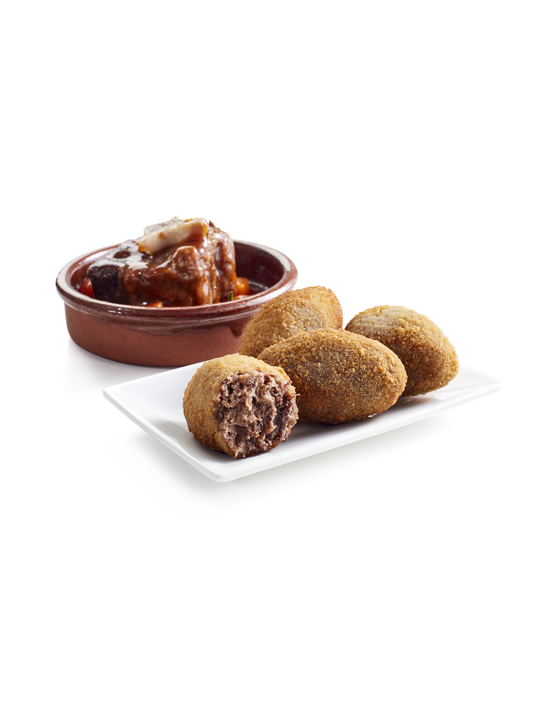 Ingredientes: rabo de vacuno (20%), carne de vacuno (19%), vino (contiene sulfitos ), agua, cebolla, preparado para rebozar (harina de trigo , agua, dextrosa, sal, cacao y levadura, almidón modificado), zanahoria, almidón de maíz, pan rallado (harina de trigo, agua, sal, levadura), aceite de oliva, harina de trigo , producto lácteo en polvo (lactosa, grasa de leche , proteínas de leche), pimiento rojo, ajo, sal, almidónzº modificado, aceite de girasol y especias.