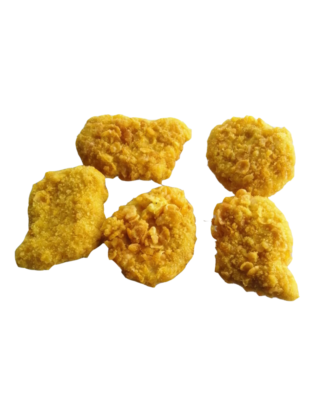 Ingredientes: Carne de pechuga de pollo (50%), empanado {rebozado de migas de copos de maíz (11%) [harina de trigo, copos de maíz (40%) (maíz, sal), extracto de cebada malteada, sal, levadura, especias (pimentón, cúrcuma)], mezcla de harina (harina de trigo, gluten de trigo), agua, harina de trigo, almidón de tapioca, sal, cúrcuma en polvo, cebolla en polvo, ajo en polvo, comino molido}, aceite de girasol, piel de ave, agua, cebolla, sal, almidón de patata, fibra de trigo, mezcla de especias (sal, dextrosa, extractos de especias), ajo granulado.