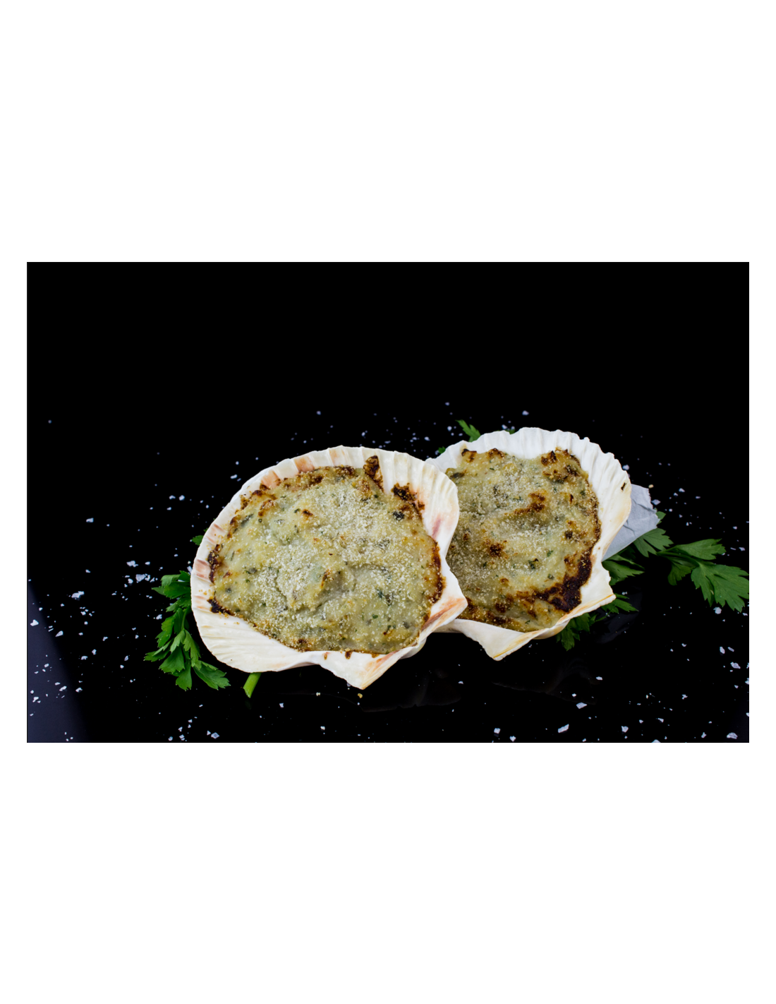 Ingredientes: Concha de vieira rellena (VIEIRA (28+/-3%) (MOLUSCO), MERLUZA (PESCADO), cebolla, MANTEQUILLA, harina de TRIGO, ajo, vino blanco (mosto de uva blanca, conservador METABISULFITO potásico), sal, perejil, pimienta negra), pan rallado (harina de TRIGO, agua, sal, levadura).