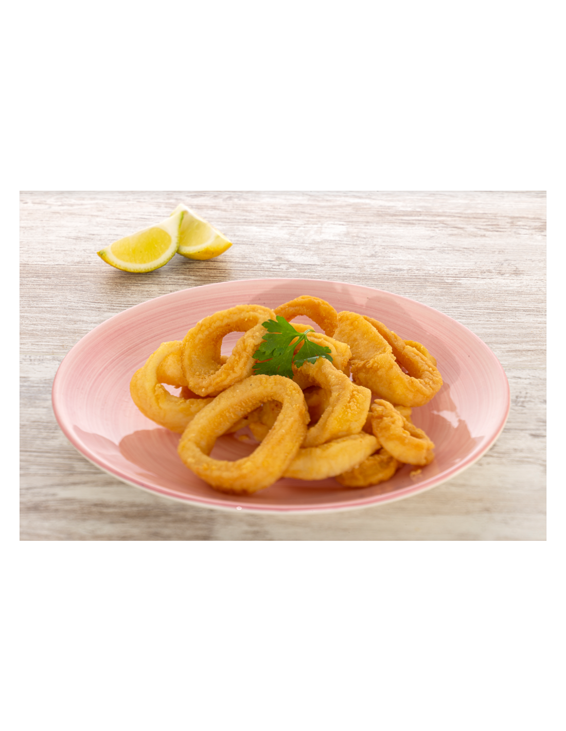 Ingredientes: Anillas de POTÓN del Pacífico (85+/-5%)(MOLUSCO)((Dosidicus gigas, capturado FAO 87 Océano Pacífico, arte de pesca: extractiva), sal, antioxidante E-330, regulador de acidez E-331 ), enharinado de maiz, harina de TRIGO y sal).