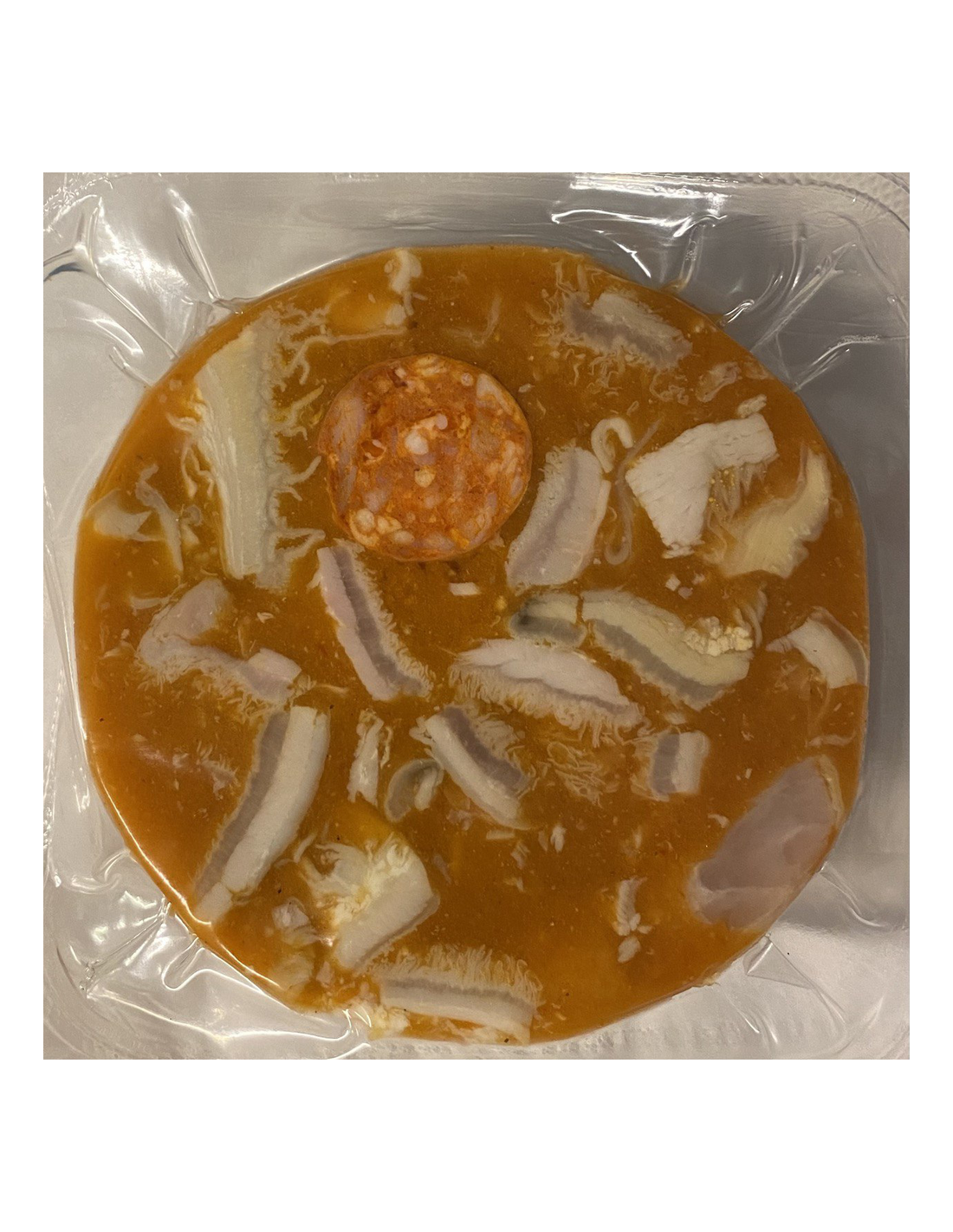 Ingredientes: Tripa de vacuno (67%), agua, patas de vacuno (9,5%), chorizo (magro de cerdo, pimentón, sal y ajo), colágeno de cerdo, gelatina de vacuno (2%), almidón de maíz, sal, especias, potenciador del sabor E-621, espesante E-415, aroma, colorante E-160c, cebolla, aceite de girasol, pimiento, pimentón, conservador E-211, corrector de acidez E-270, ajo y pimienta.