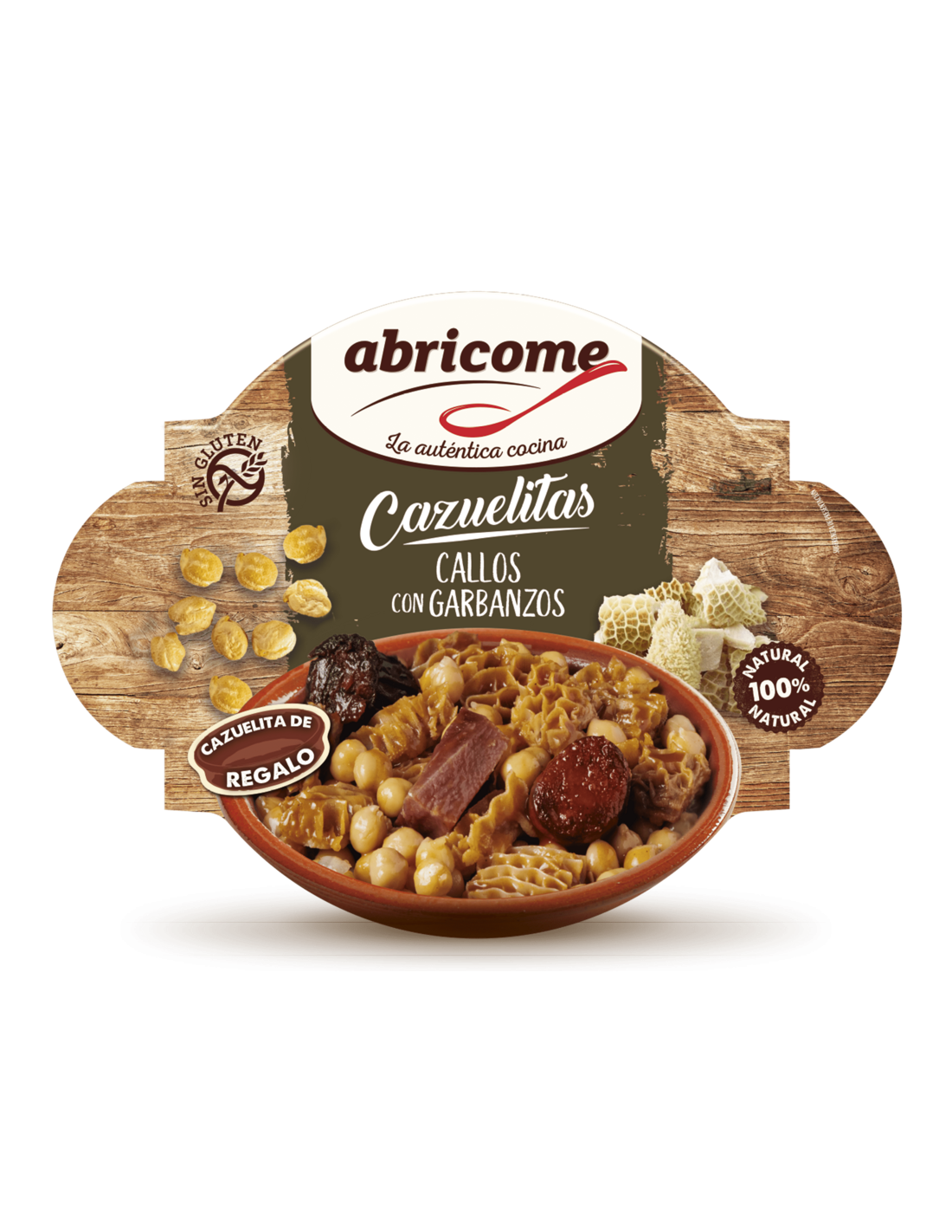Ingredientes: Callos de vacuno 37%, salsa (agua, manteca de cerdo, almidón de patata modificado, tomate concentrado, sal, especias y estabilizante [goma xantana]), garbanzos (10% en seco), manos de vacuno , chorizo (carne y papada de cerdo, sal, pimentón dulce, ajo y harina de arroz) , morcilla (tocino de cerdo, cebolla, sangre de cerdo, harina de arroz, sal y especias) y jamón serrano (jamón de cerdo, sal, dextrosa, antioxidante [ascorbato de sodio] y conservador [nitrito sódico]).