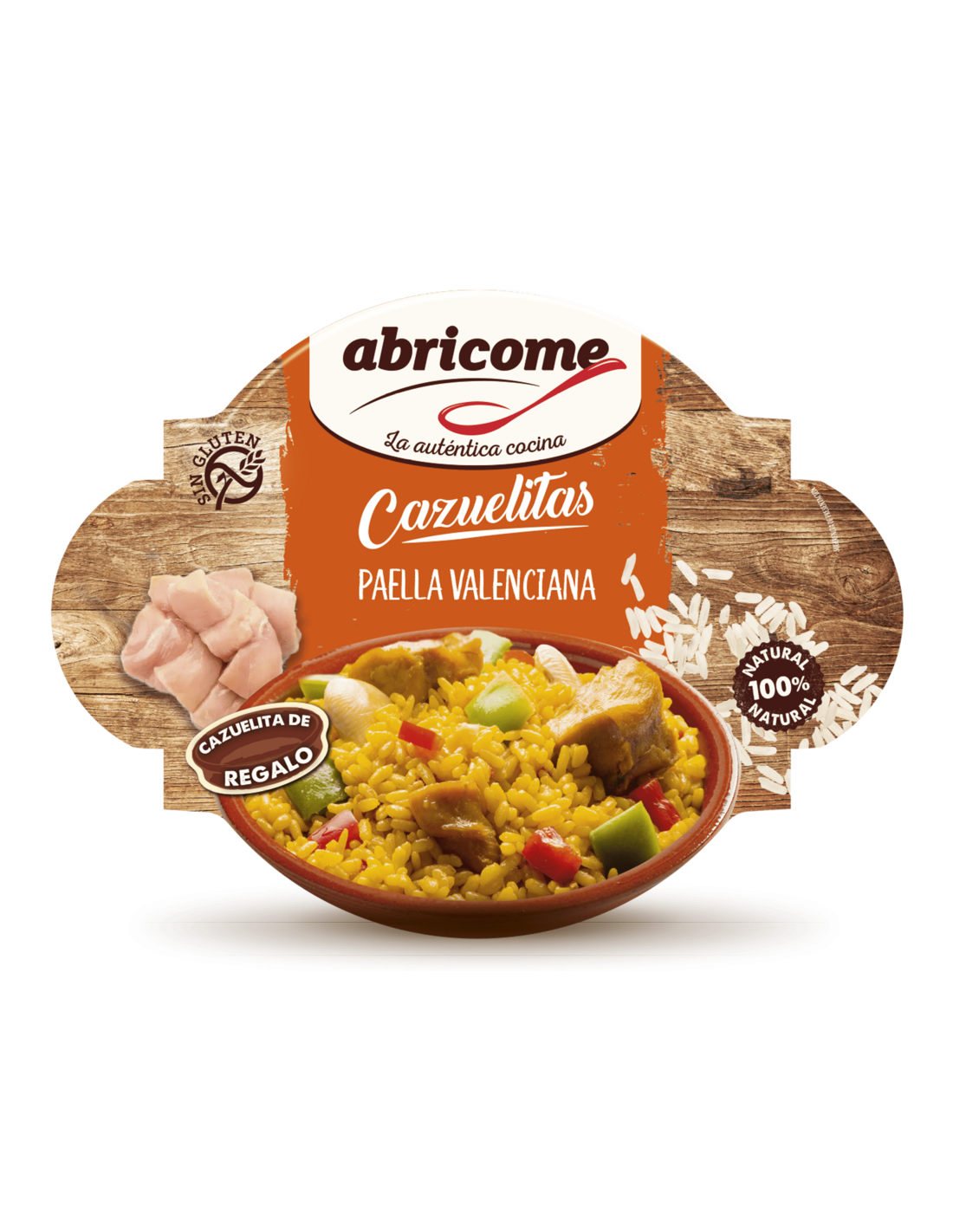 Ingredientes: Agua, 28% came de pollo, 18% arroz, judías verdes, pimiento rojo, aceite de girasol, grasa de sal, ajo, tomate concentrado, especias, (goma xantana) y colorante (extracto de cúrcuma).