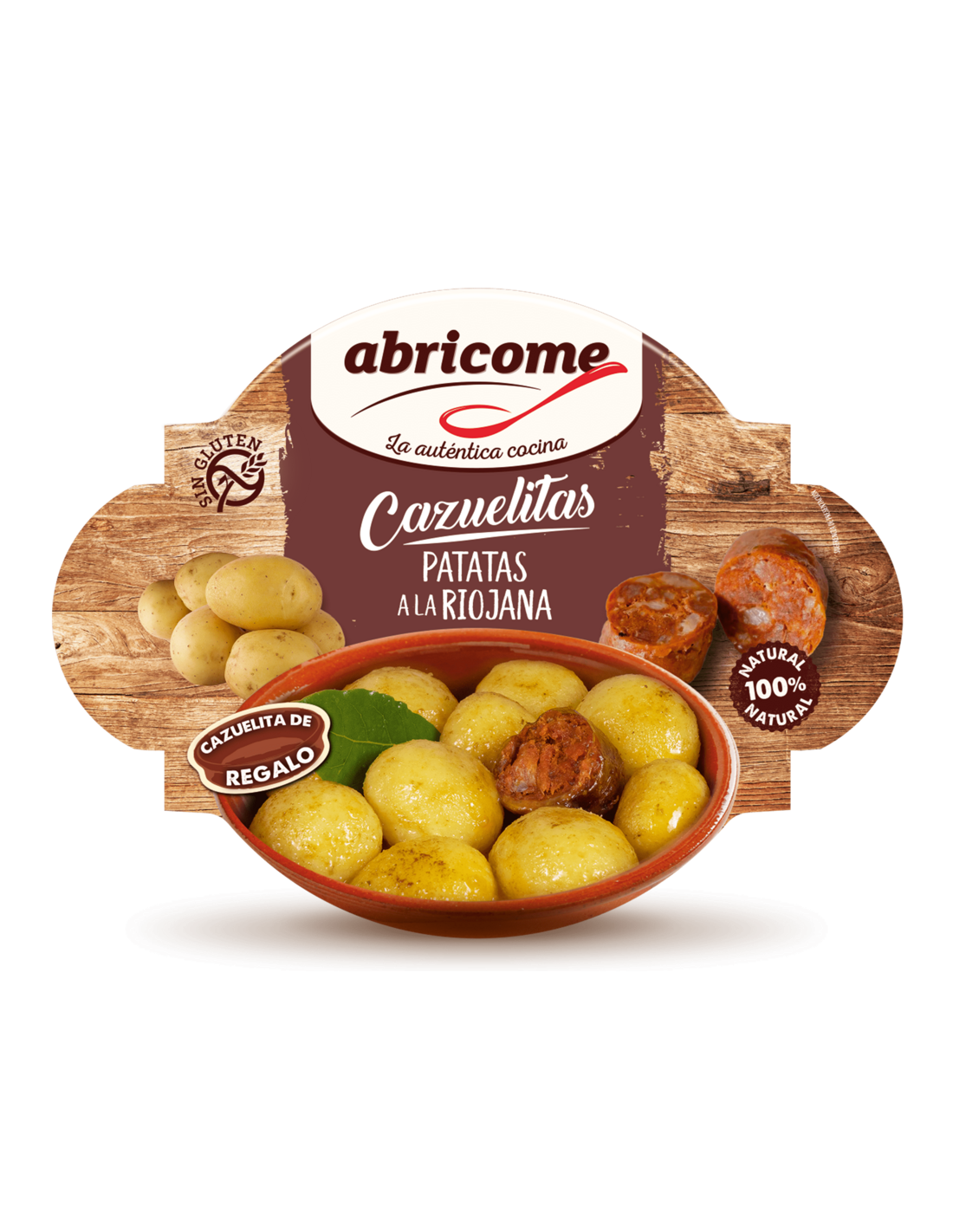 Plato cocinado listo para consumir. Envase circular a modo de cazuelita. Patata parisina con 2 trozos de chorizo ahumado y una hoja de laurel, salsa con textura cremosa y color rojo ocre.