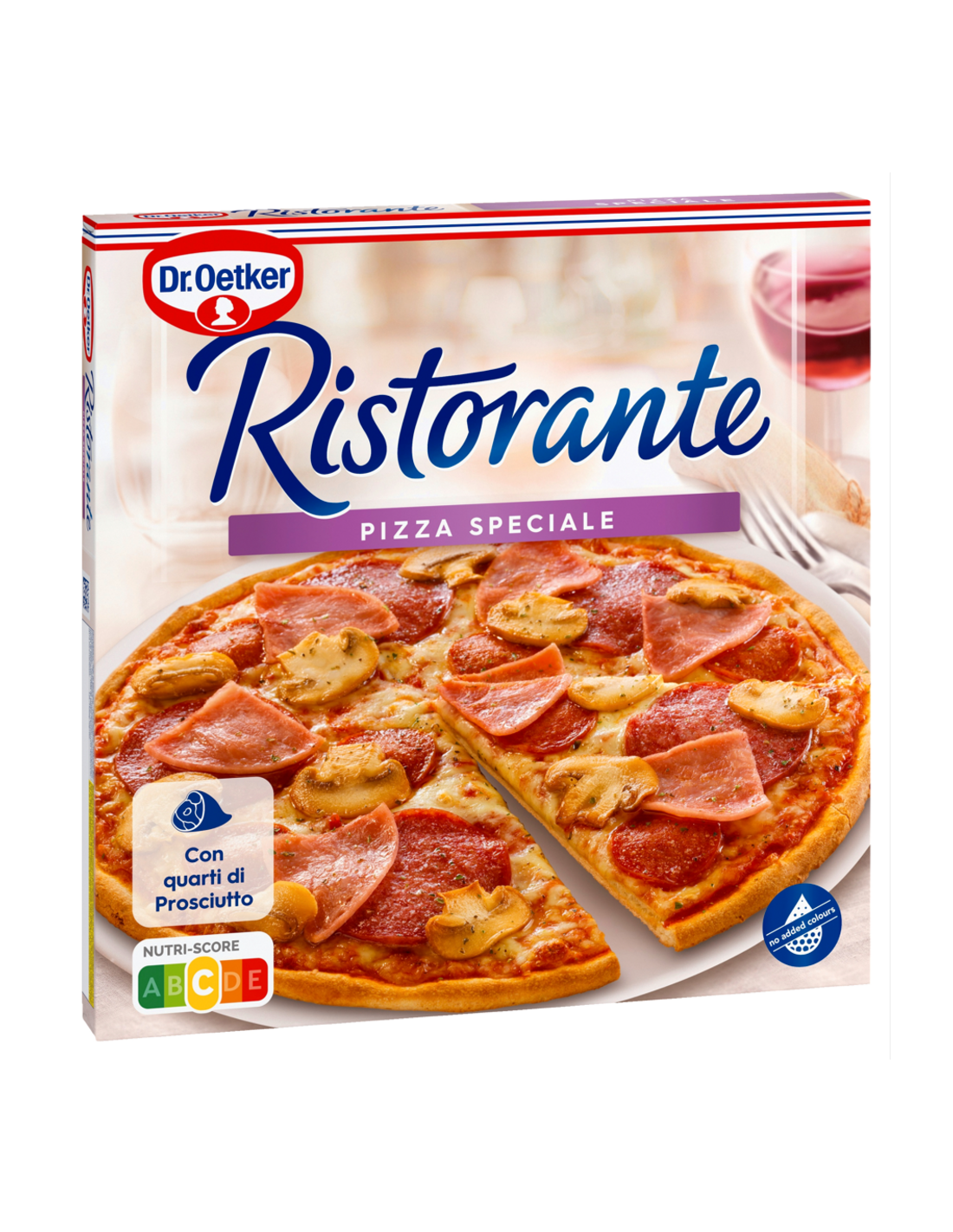 Ingredientes: Harina de TRIGO, 15% QUESO (MOZZARELLA, EDAM), 12% tomates tamizados, agua, 6,4% salami (carne de cerdo, manteca de cerdo, sal, especias, dextrosa, cebolla en polvo, ajo en polvo, extractos de especias, estabilizante (nitrito sódico), antioxidante (extractos de romero), humo), 6,2% concentrado de tomate, 5,6% jamón cocido sabor ahumado (carne de cerdo, agua, sal, dextrosa, estabilizantes (difosfatos, trifosfatos, nitrito sódico), antioxidante (ascorbato sódico), extracto de especias, aroma de humo), 5,6% champiñones cultivados (Agaricus bisporus), aceite refinado de nabina, 3,3% pepperoni (salami picante) (carne de cerdo, manteca de cerdo, sal, especias, dextrosa, cebolla en polvo, ajo en polvo, extractos de especias, estabilizante (nitrito sódico), antioxidante (extractos de romero), humo), levadura, sal, azúcar, aceite de oliva virgen extra, orégano, albahaca, pimienta negra, pimentón, perejil
