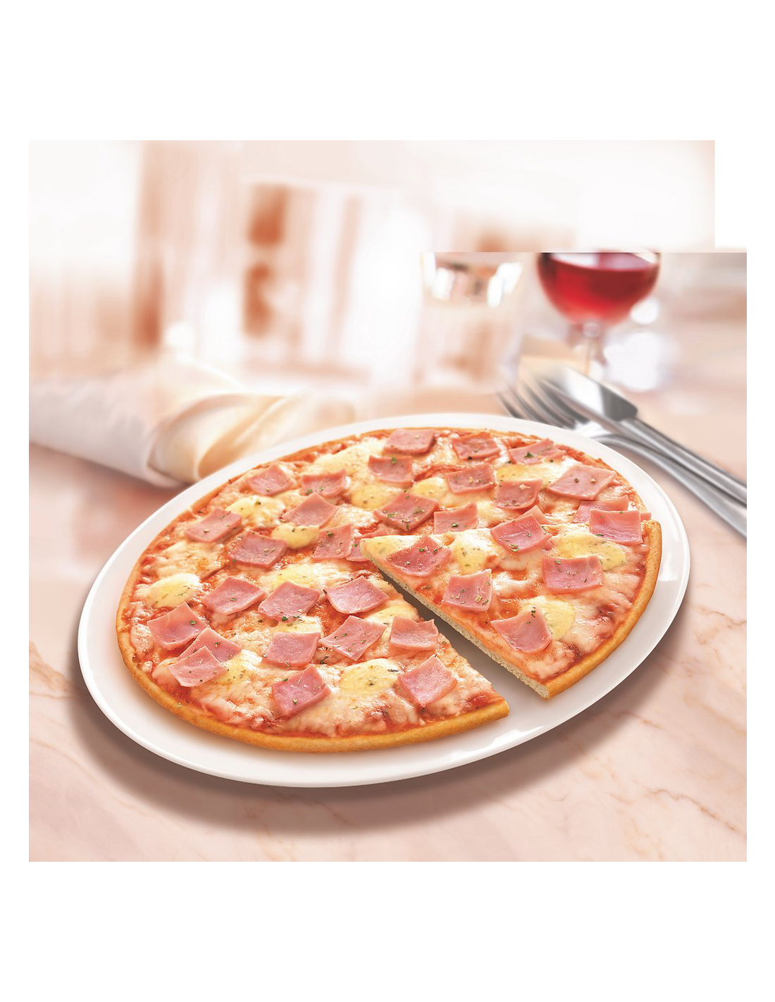 Ingredientes: Agua, 14% QUESO (MOZZARELLA, EDAM), 14% jamón cocido sabor ahumado (carne de cerdo, agua, sal, dextrosa, estabilizantes (difosfatos, tnfosfatos, nitrito sódico), antioxidante (ascorbato sódico), extracto de especias, aroma de humo), harina de arroz, 12% tomates tamizados, almidón de patata, 5,9% concentrado de tomate, copos de patata, aceite refinado de nabina, proteína de guisante, azúcar, levadura, sal, espesantes (hidroxipropilmetilcelulosa, goma xantana, goma guar), aceite de oliva virgen extra, emulgentes (ésteres lácticos de monoglicéridos y diglicéridos de ácidos grasos, ésteres acéticos de monoglicéridos y diglicéridos de ácidos grasos), yema de HUEVO, jarabe de glucosa, proteínas de la LECHE, almidón modificado, especias, aroma, orégano, ajo, perejil, dextrosa, acidulantes (ácido láctico, lactato cálcico), antioxidante (extractos de romero)