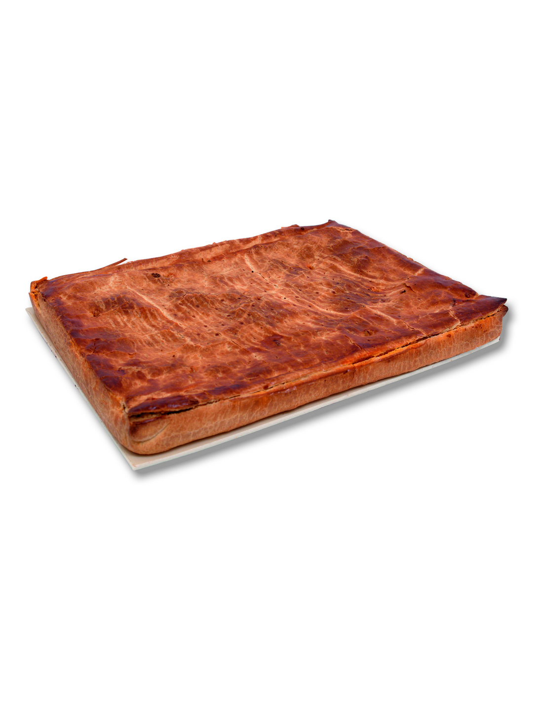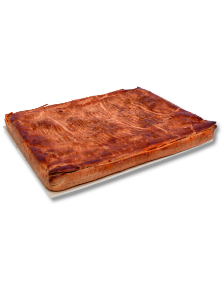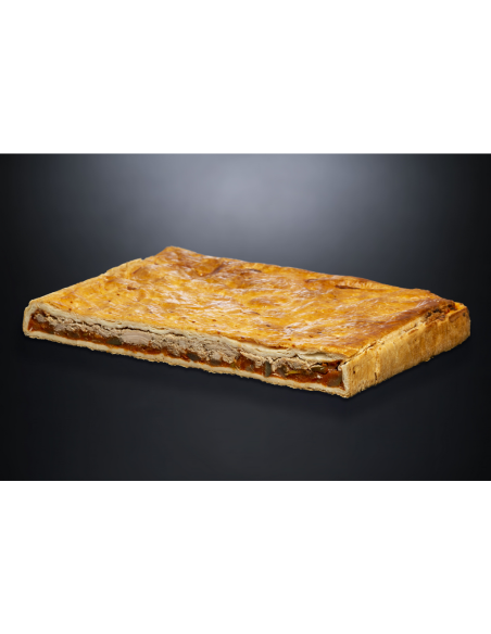 virgen extra, azúcar, sal, estabilizantes (E-1422, E-410, E-407), conservador (E-202), corrector de acidez (E-330)], harina de trigo [harina de trigo y antioxidante (E-300)], miga de atún (pescado) en aceite de girasol (19%) [atún, aceite de girasol, sal], margarina [grasas vegetales (palma), aceites vegetales (girasol), agua, monodiglicéridos de ácidos grasos E-471 (palma), sal, aromas, corrector de acidez (E-330), colorante betacaroteno] agua, aceite de girasol, sal [sal, antiaglomerante (E-536)], conservadores (E-282, E-202) y baño del hojaldre [aceites vegetales (colza), componentes de Ia leche (proteína de la leche y lactosa), jarabe de glucosa, aroma natural, estabilizantes (E-407, E-450), emulgente (E-339)].