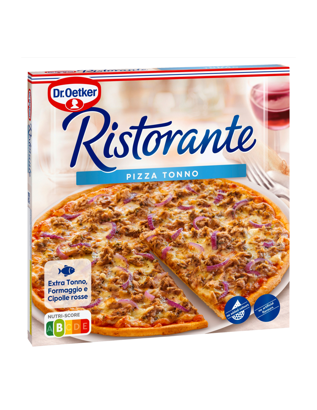 Ingredientes: Harina de TRIGO, 16% QUESO (MOZZARELLA, EDAM), 13% tomates tamizados, 9,1% ATÚN (Katsuwonus pelamis), agua, 6,5% concentrado de tomate, 5,5% cebolla, aceite refinado de nabina, aceite refinado de girasol, 1 ,8% cebollas fritas (cebolla, aceite refinado de nabina, sal), levadura, sal, azúcar, aceite de oliva virgen extra, orégano, albahaca, perejil, cebollino, ajo, pimentón, pimienta negra