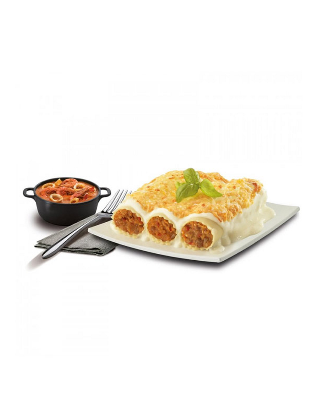 Ingredientes: agua, pasta alimenticia fresca (harina de trigo, sémola de trigo, agua), aceite de nabina, gamba (5%) [gamba (crustáceos), estabilizantes: trifosfatos, polifosfatos; conservador: metabisulfito sódico], merluza 4% (pescado), cefalópodos cocidos (3,5%) (sepia (1,8%)(moluscos), potas (1,7%) (moluscos), agua, sal], harina de trigo, queso cheddar [leche pasteurizada, fermentos lácticos (leche), sal, estabilizante: cloruro cálcico; cuajo, colorante: carotenos), almidón modificado, texturizado de trigo, leche desnatada en polvo, leche entera en polvo, tomate, almidón de maíz, cebolla, sal, cebolla frita, pimiento rojo frito, vino, ajo, nata pasteurizada (leche), aromas naturales (contiene crustáceos, pescado, moluscos), pescado de roca, rape (pescado), especias, cangrejo (0,03%) (crustáceos), aceite de oliva, zanahoria, apio, puerro, pan rallado (harina de trigo, levadura, sal).