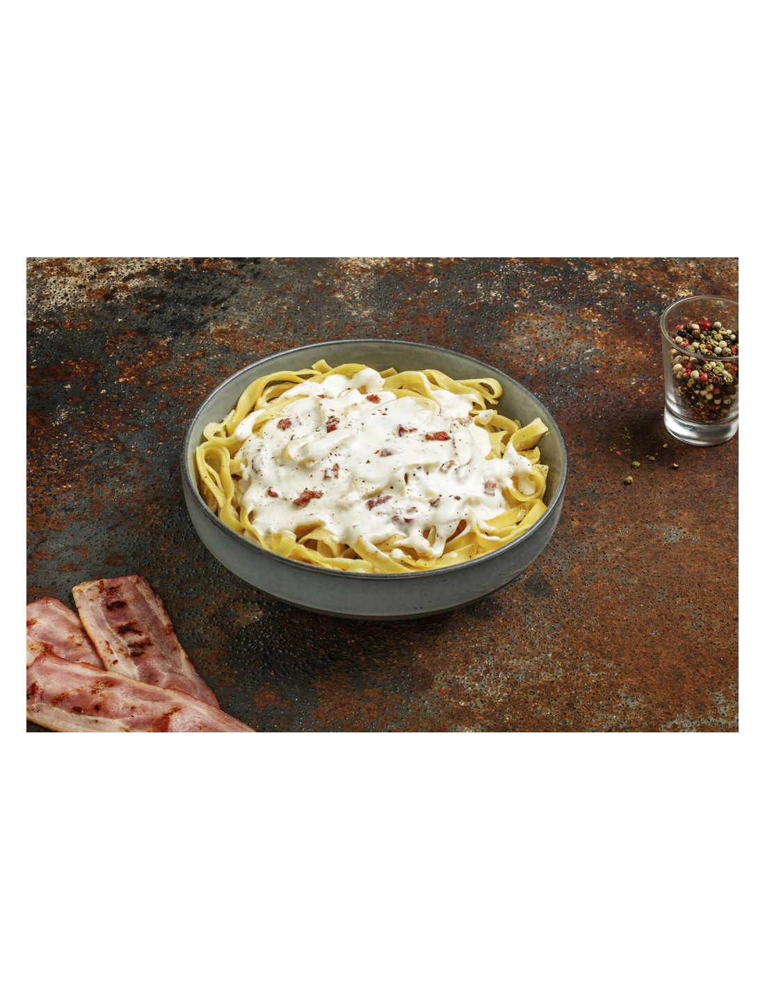 Ingredientes: Pasta fresca al huevo (51%): Sémola de trigo duro, agua, huevo, sal y cúrcuma. Salsa carbonara (49%): Agua, bacon (18%) (panceta de cerdo, agua, sal, azúcar, estabilizantes (E451i, E407), antioxidante E316, conservador E250, aroma de humo natural y especias), nata pasteurizada (nata estabilizante E407), aceite de girasol, cebolla prefrita (cebolla y aceite de girasol), queso, leche entera en polvo, almidón, sal y especias.