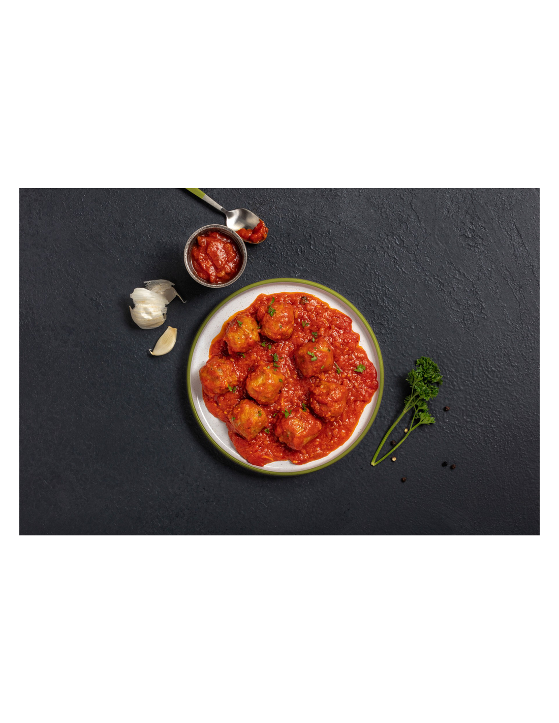 ALBÓNDIGAS DE TERNERA 46%: Agua, carne de ternera 29%, SOJA , PAN rallado 9% , preparado de albóndiga (sal, almidón de maíz, proteína vegetal (SOJA), especias naturales (ajo molido, cebolla molida, pimienta), azúcar, antioxidantes (e-330, e-575 y e-301)), emulgente (e-450), vino blanco, ajo, perejil y pimienta negra.