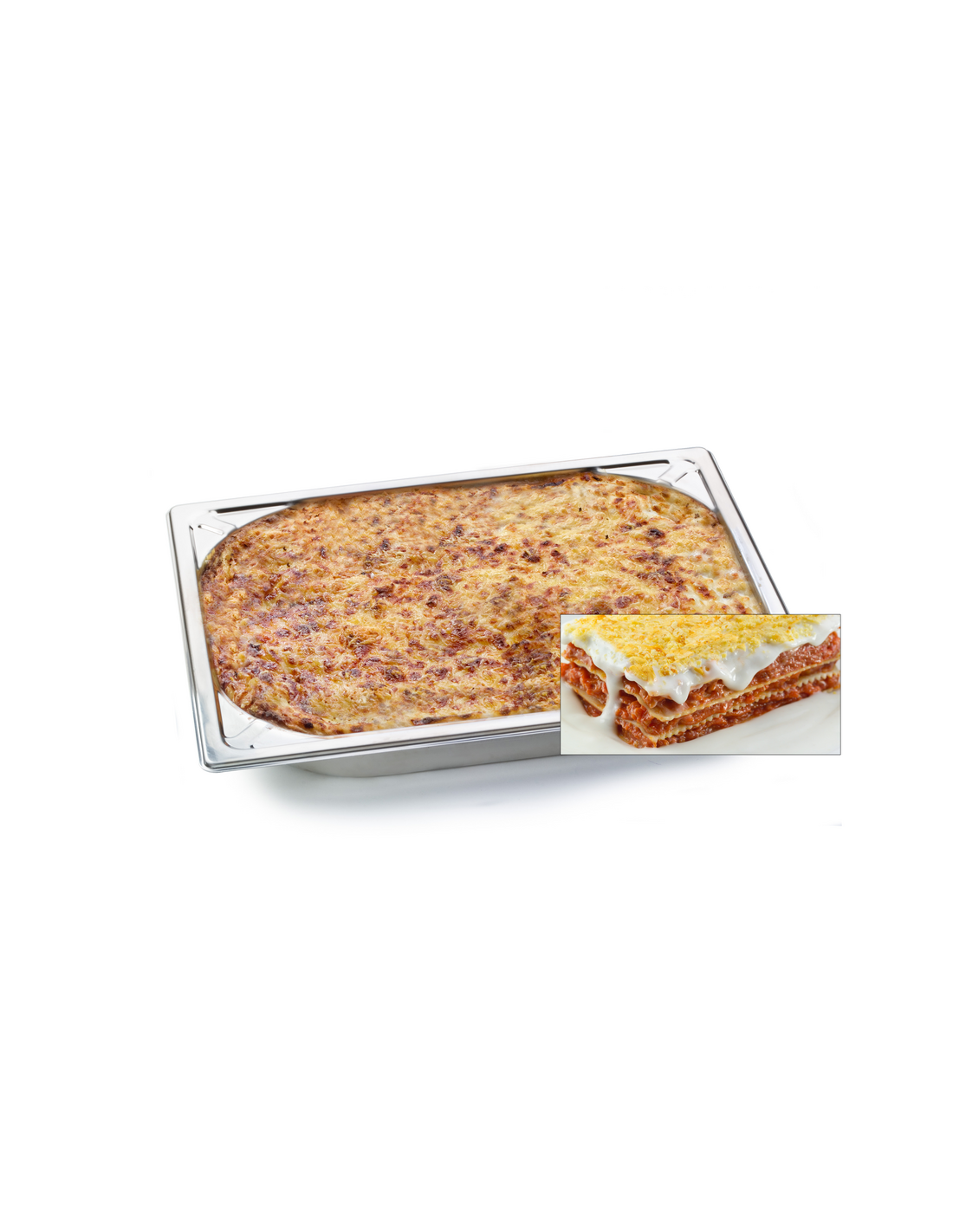 Lasaña de carne de ternera y tomate, con bechamel y queso rallado.