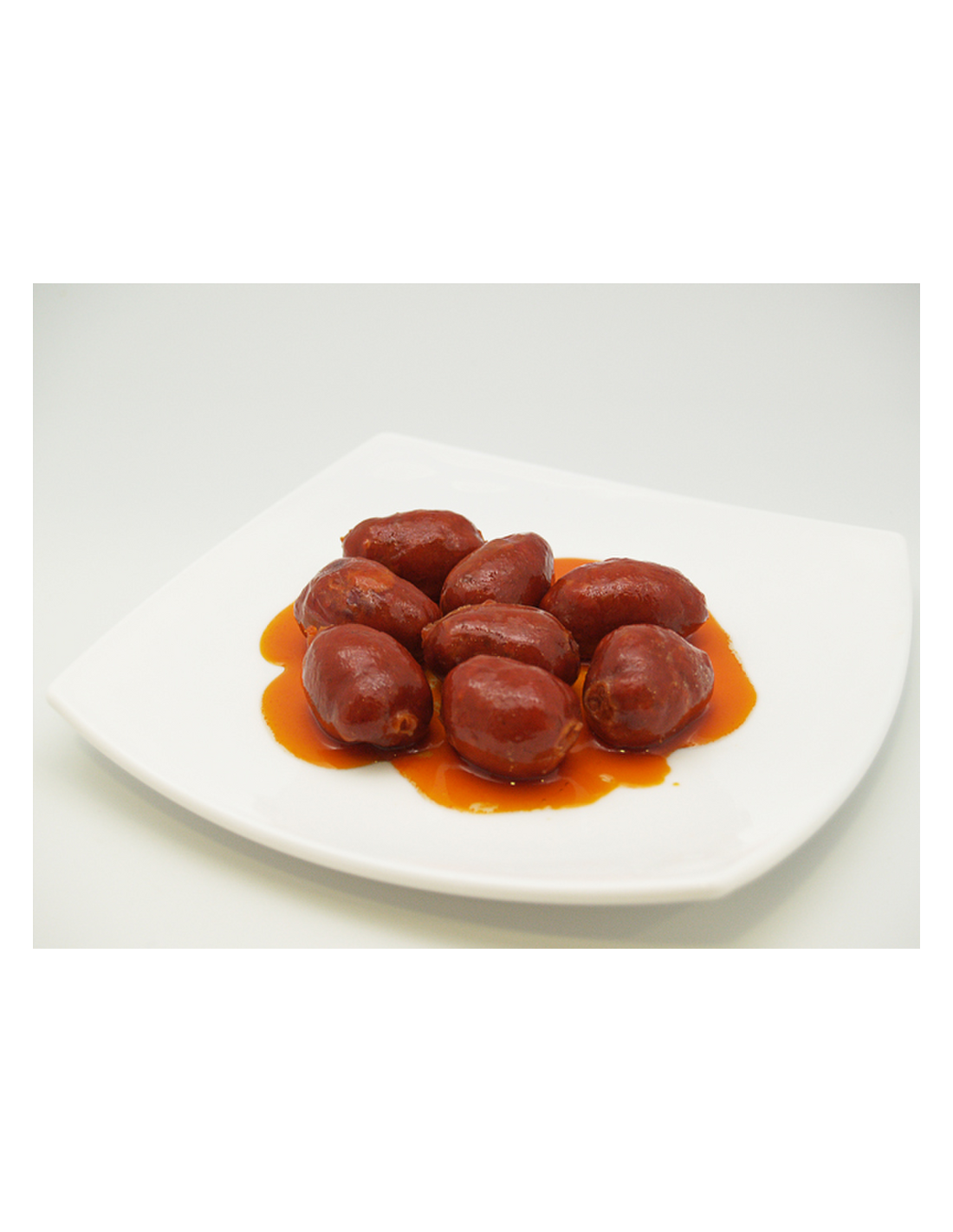Ingredientes: Chorizo 80% (carne de cerdo, sal, pimentón, proteína de guisante, dextrina, ajo, azúcar, especias, antioxidante E-301, estabilizador E-450, potenciador de sabor E-621, conservadores: E-250, E-252. Tripa natural de cerdo, aceite de oliva, sidra 4%.