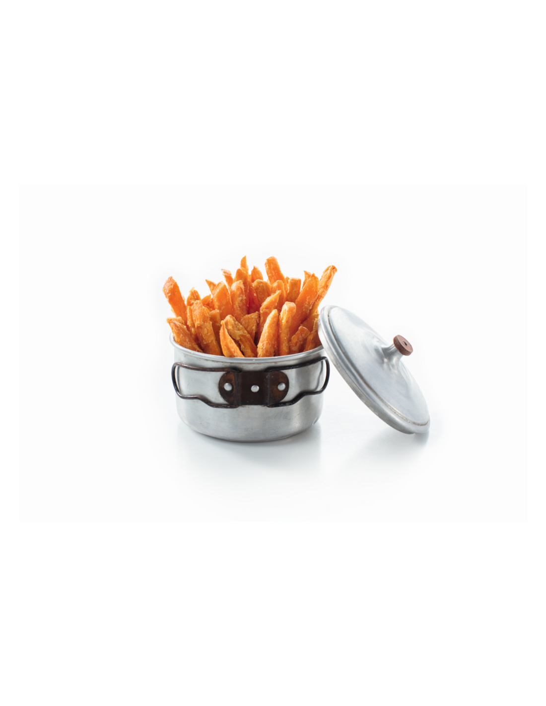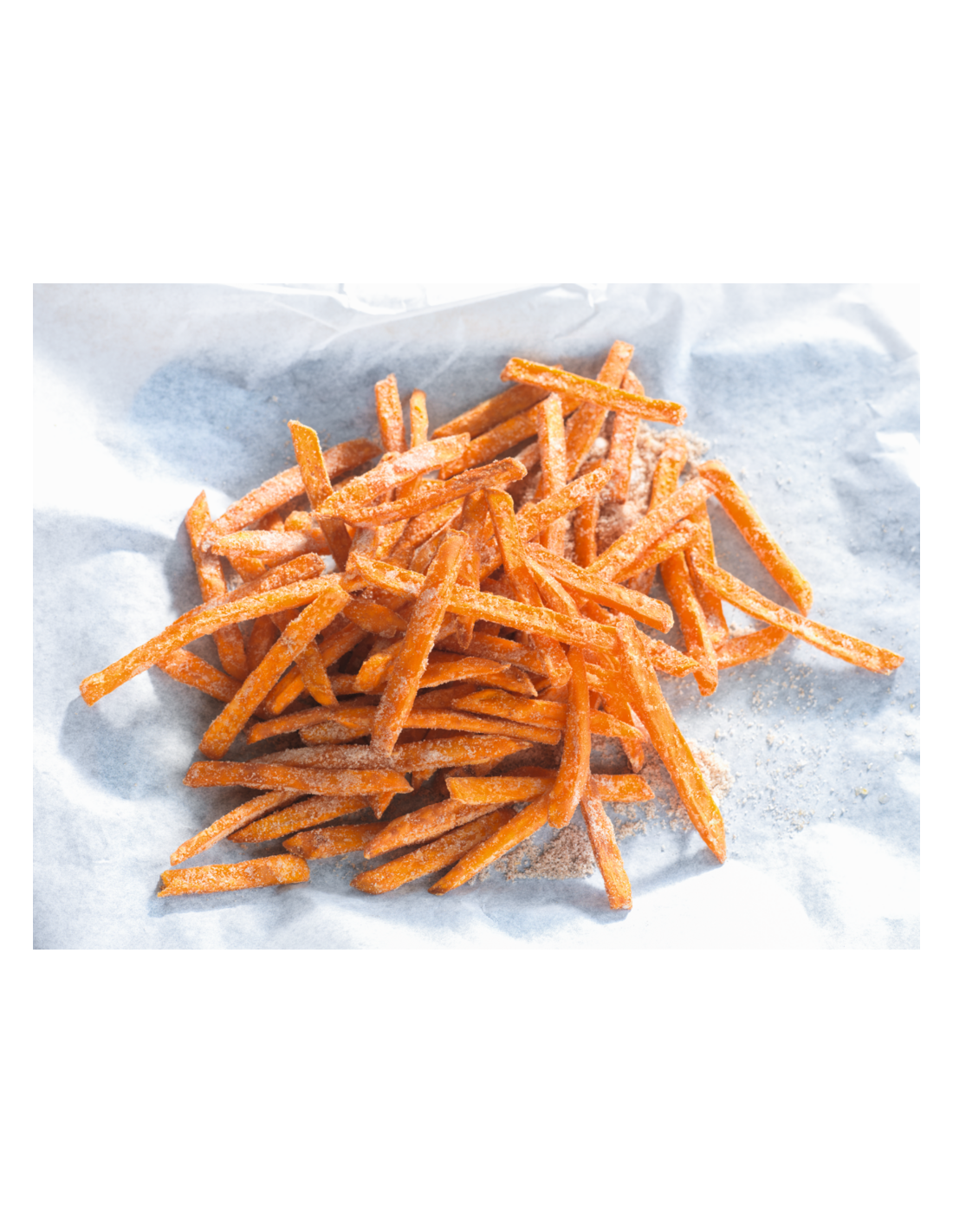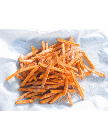 Ingredientes: Batatas (84%), cobertura (11%) (almidón de patata modificado, azúcar, harina de arroz, almidón de maíz, dextrina, sal, gasificantes (E450, E500), colores (E160c, E100), espesante (E415)). aceite de colza (5%).