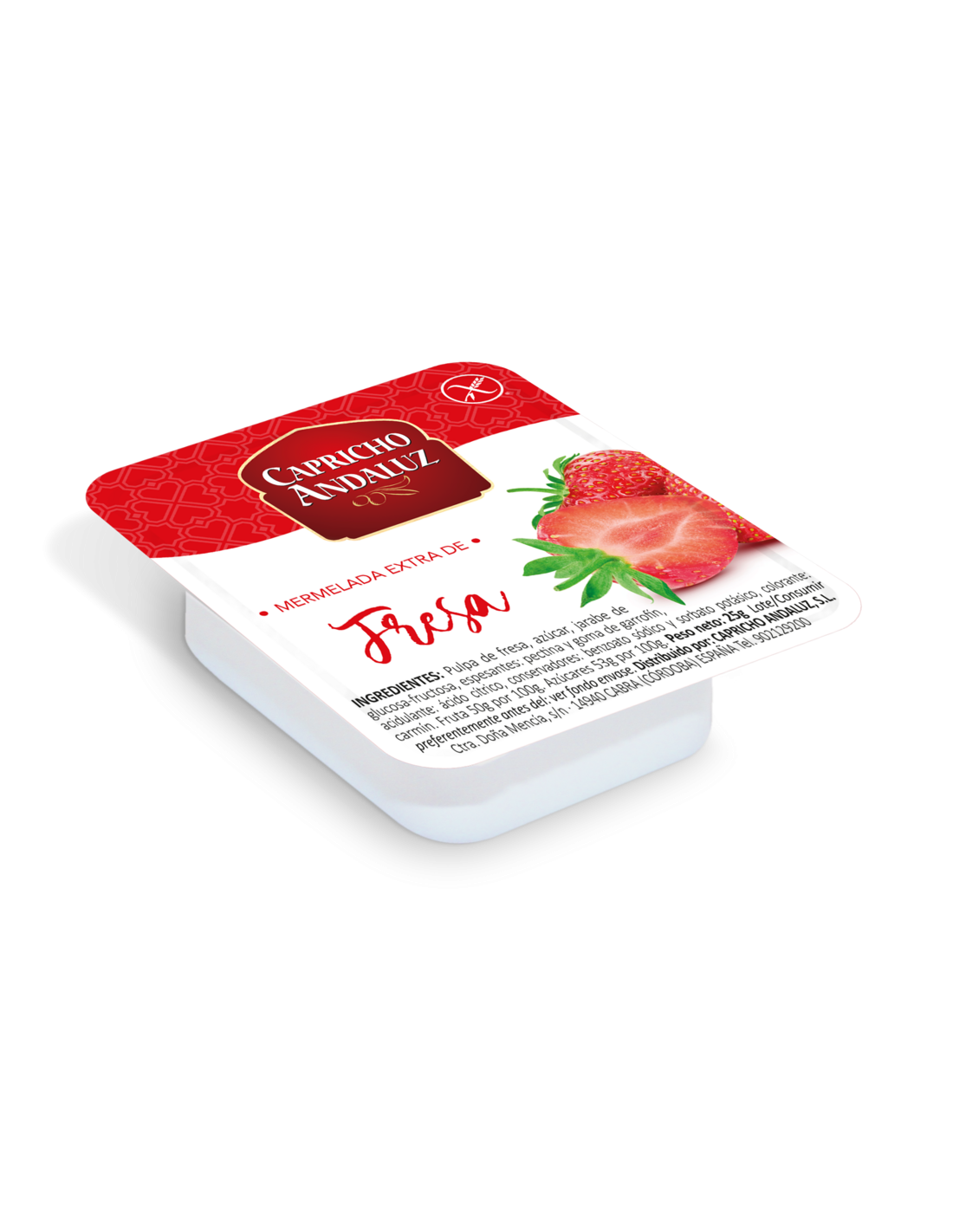 Ingredientes: Pulpa de fresa, azúcar, jarabe de glucosa y fructosa, espesantes: pectina (E-440)y goma guar (E-412) acidulante: ácido cítrico (E-330), conservantes: benzoato sódico (E-211) y sorbato potásico (E-202), colorante: carmín (E-120).