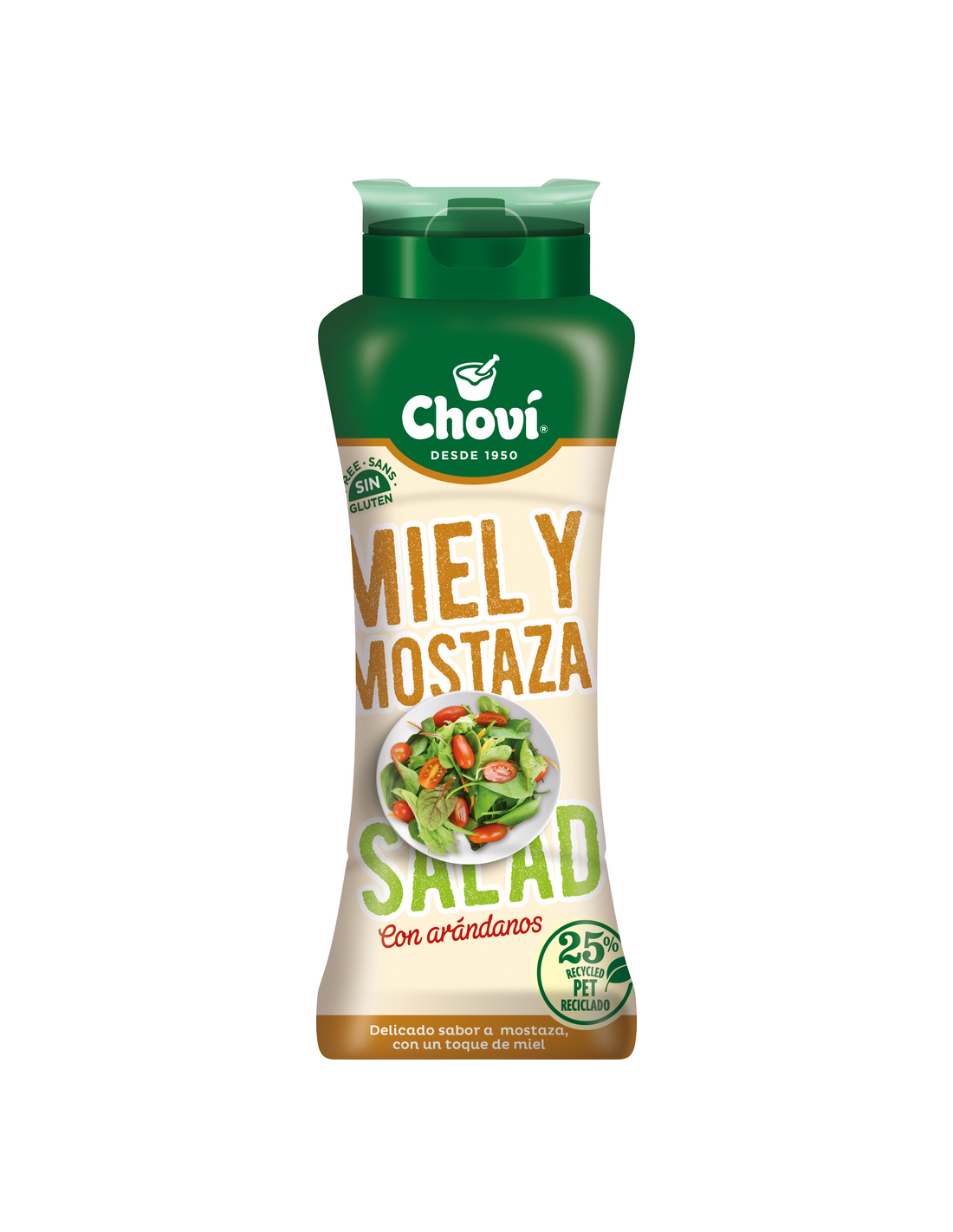 Ingredientes: Agua, aceite vegetal, miel 10%, MOSTAZA 5% (agua, MOSTAZA 17%, vinagre, sal, aromas naturales, estabilizantes: goma guar y goma xantana, acidulante: ácido cítrico), azúcar, vinagre de vino blanco, yema de HUEVO de gallinas camperas, arándanos deshidratados 1,9%, sal, almidón modificado, aroma natural, acidulante: ácido cítrico, estabilizante: oma xantana, conservador: E202 antioxidante E385.
