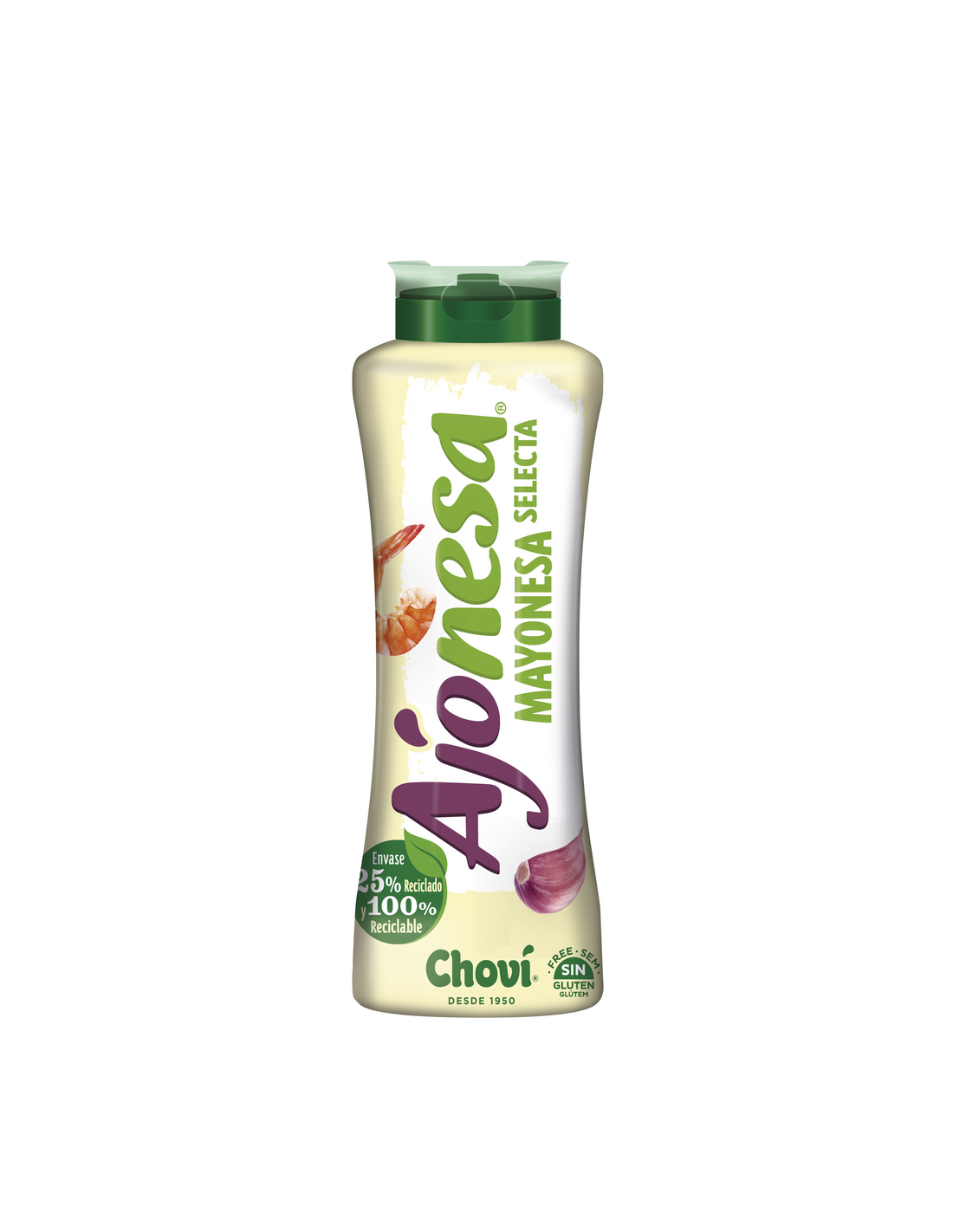 Ingredientes: Aceite vegetal* 75%, agua, yema de HUEVO de gallinas camperas 6%, jugo de limón concentrado, ajo 1,25%, azúcar, vinagre, sal, almidón modificado, colorante: extracto de pimentón, conservador: sorbato potásico, antioxidante EDTA de calcio y disodio.